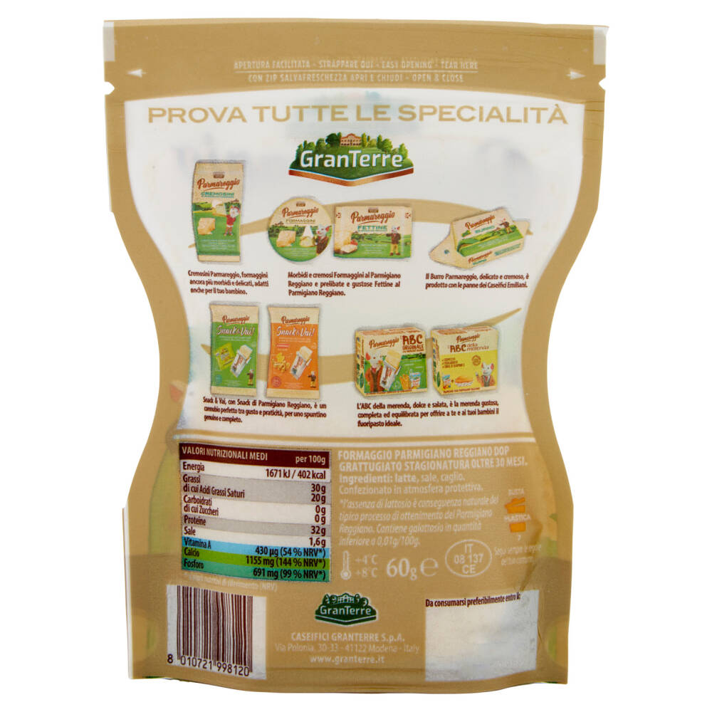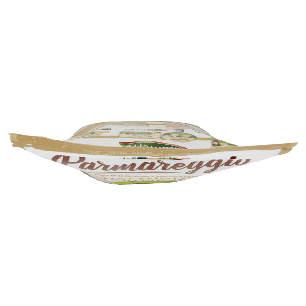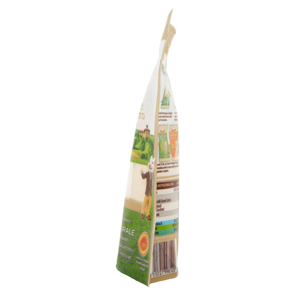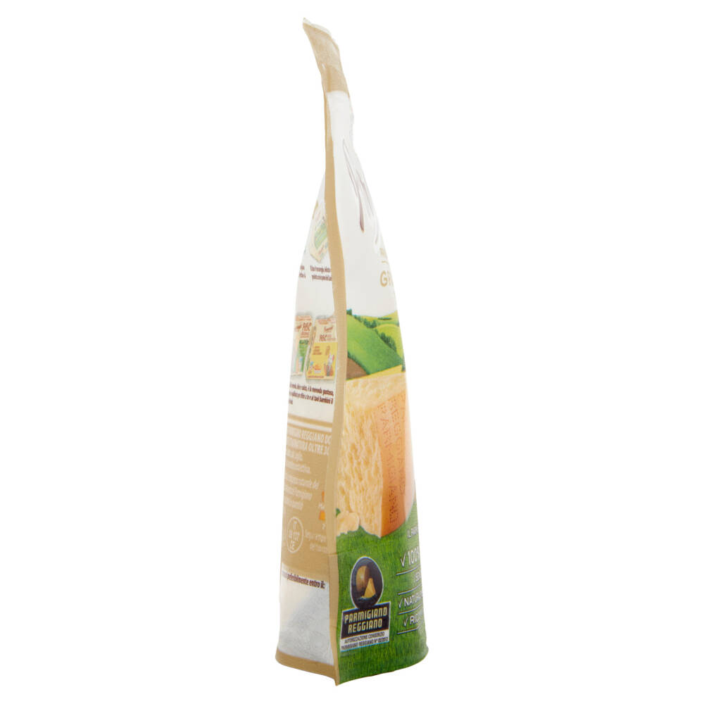 Apertura facilitata Con zip salvafreschezza apri e chiudi Il Parmigiano Reggiano è: - 100% Naturale - Senza conservanti - Naturalmente senza lattosio* - Ricco in calcio e proteine Denominazione d'Origine Protetta *l'assenza di lattosio è conseguenza naturale del tipico processo di ottenimento del Parmigiano Reggiano. Contiene galattosio in quantità inferiore a 0,01g/100g