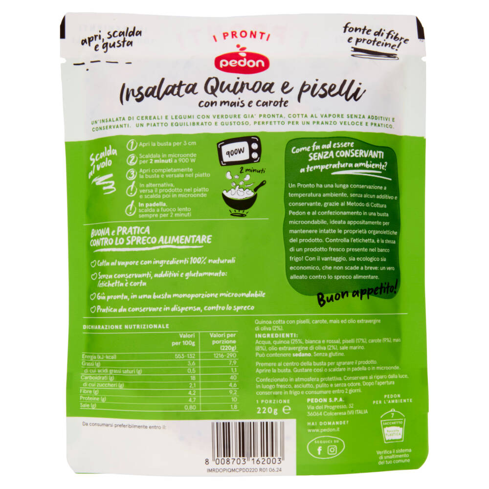 Acqua Quinoa (25%, bianca e rossa) Piselli (17%) Carote (9%) Mais (8%) Olio extravergine di oliva (2%) Sale marino Può contenere sedano Senza glutine
