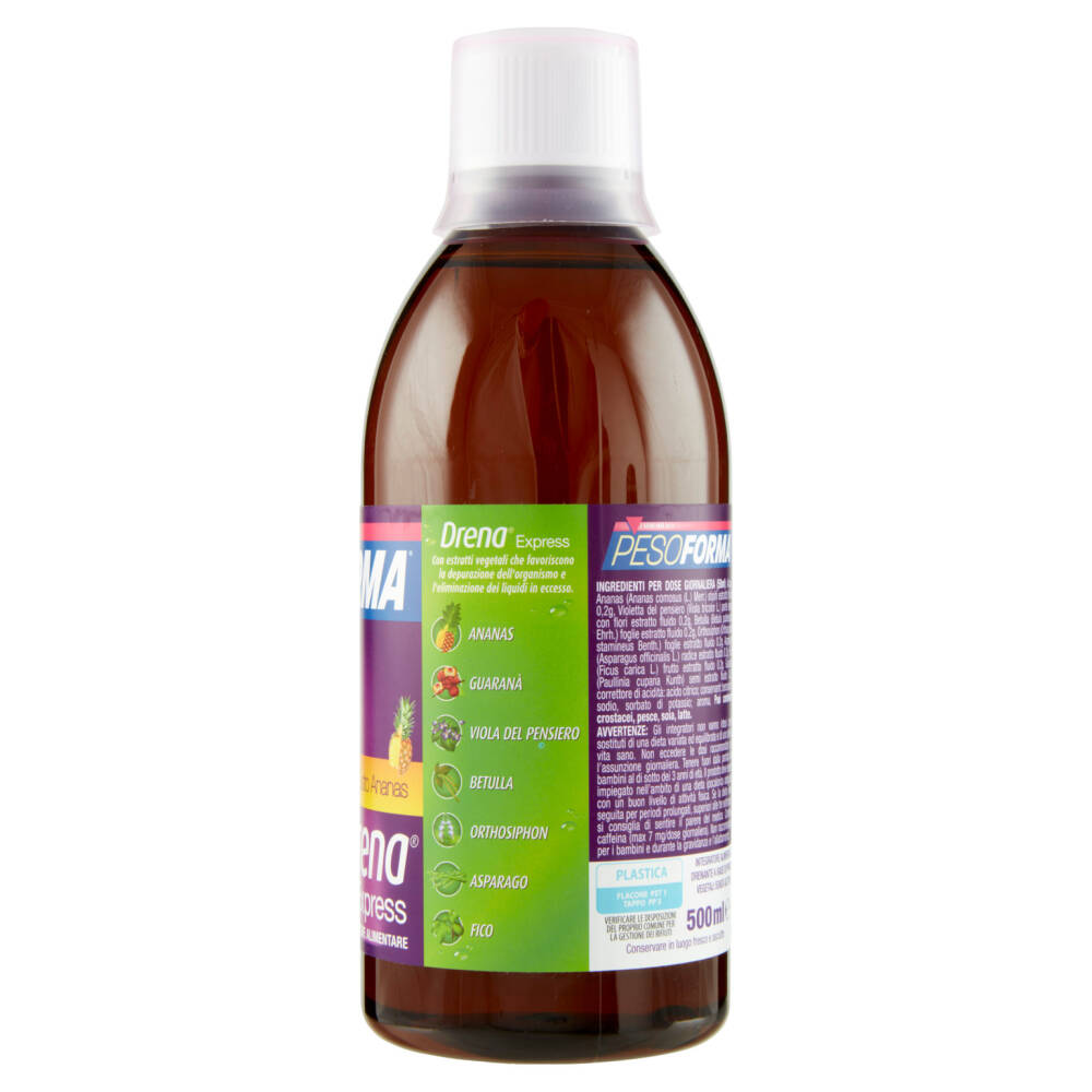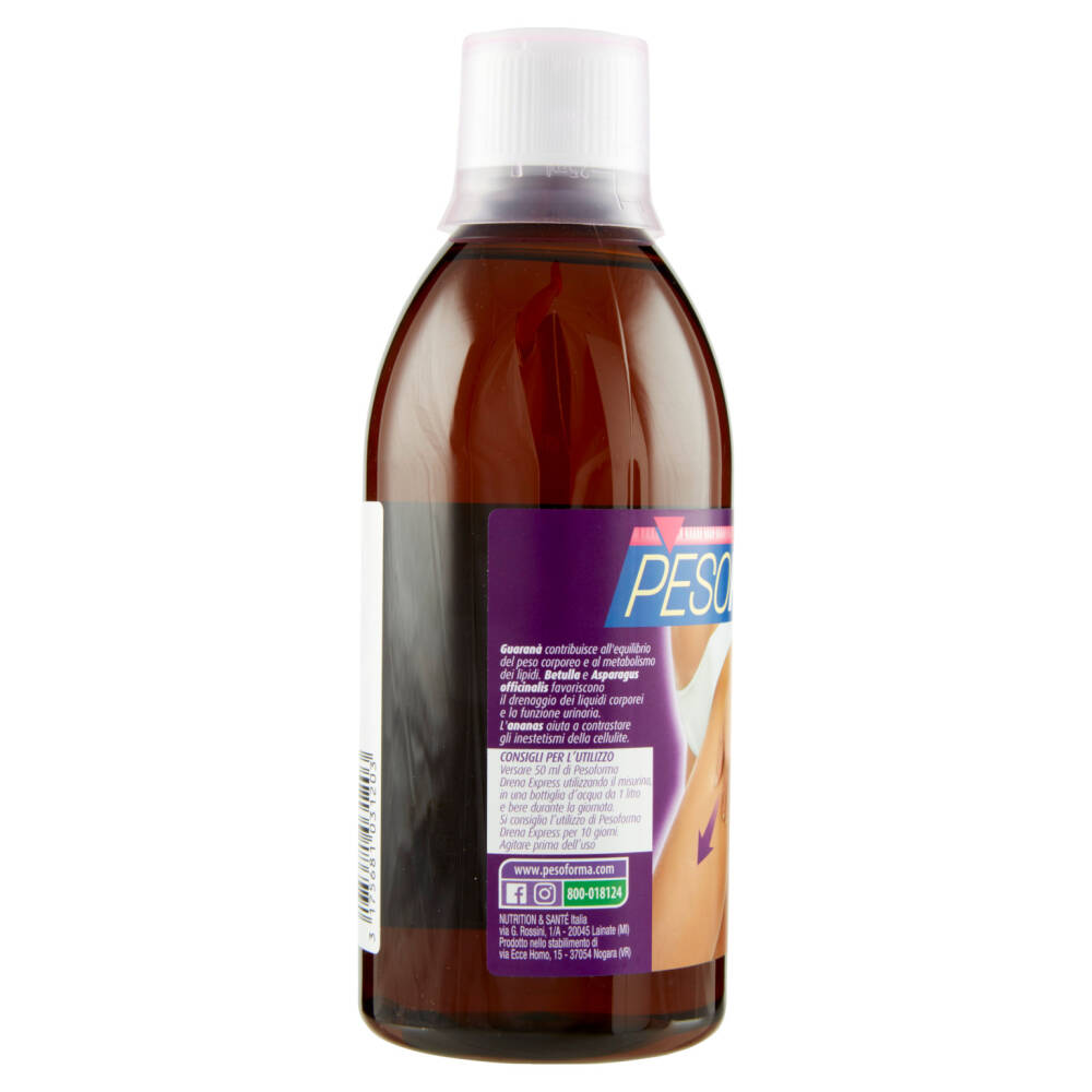 Versare 50 ml di Pesoforma Drena Express utilizzando il misurino, in una bottiglia d'acqua da 1 litro e bere durante la giornata. Si consiglia l'utilizzo di Pesoforma Drena Express per 10 giorni. Agitare prima dell'uso