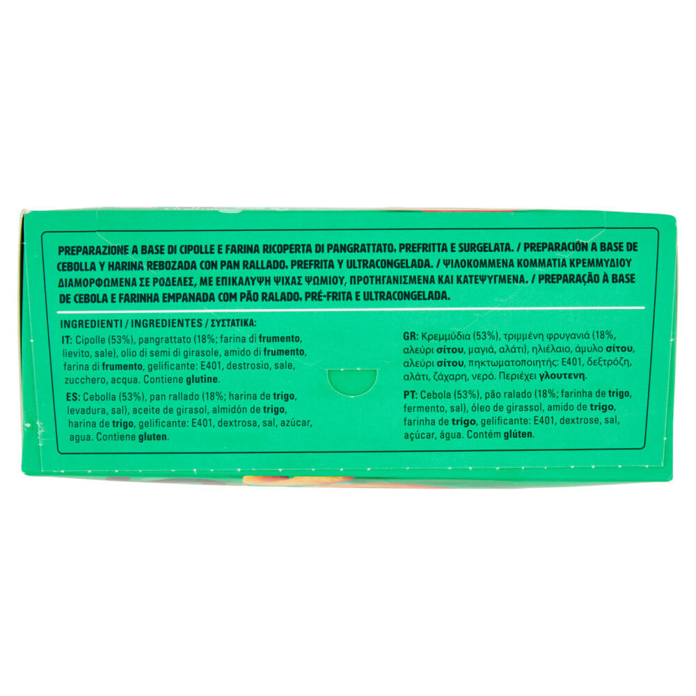 Cipolle (53%) Pangrattato (18%; farina di frumento, lievito, sale) Olio di semi di girasole Amido di frumento Farina di frumento Gelificante: E401 Destrosio Sale Zucchero Acqua Contiene glutine