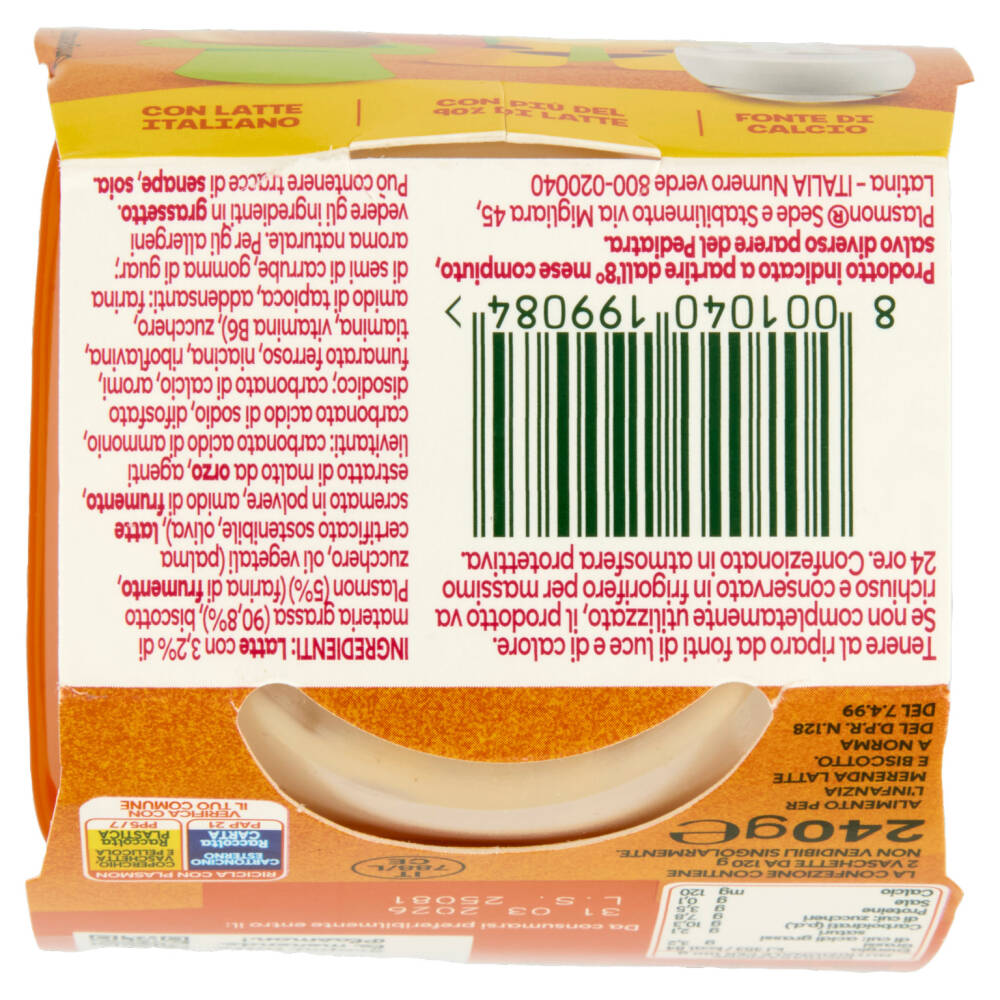 Biscotto Plasmon (5%) (farina di frumento, zucchero, oli vegetali (palma certificato sostenibile, oliva), latte scremato in polvere, amido di frumento, estratto di malto da orzo, agenti lievitanti: carbonato acido di ammonio, carbonato acido di sodio, difosfato disodico; carbonato di calcio, aromi, fumarato ferroso, niacina, riboflavina, tiamina, vitamina B6)