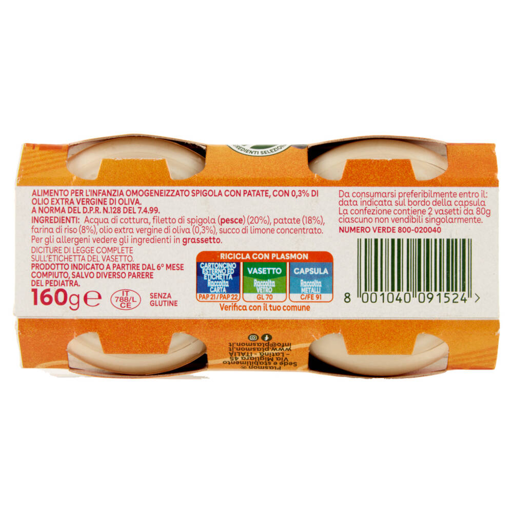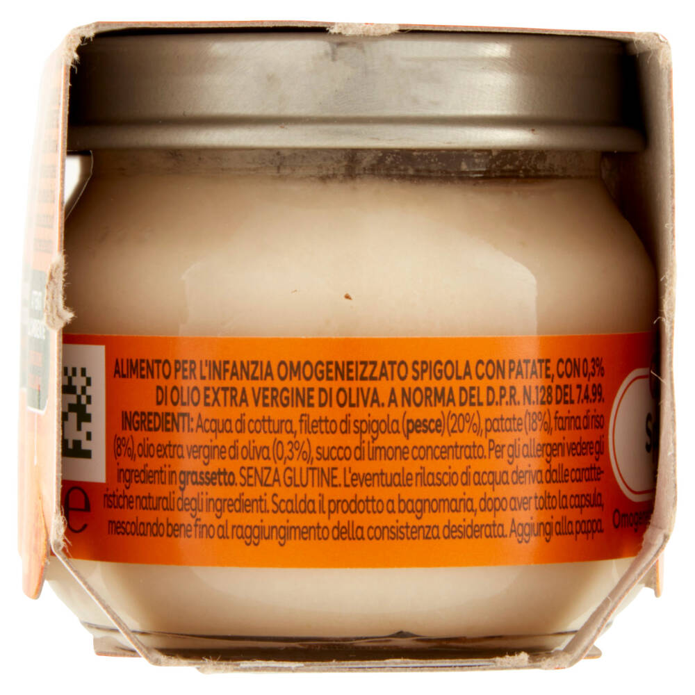 Alimento per l'infanzia omogeneizzato spigola con patate, con 0,3% di olio extra vergine di oliva