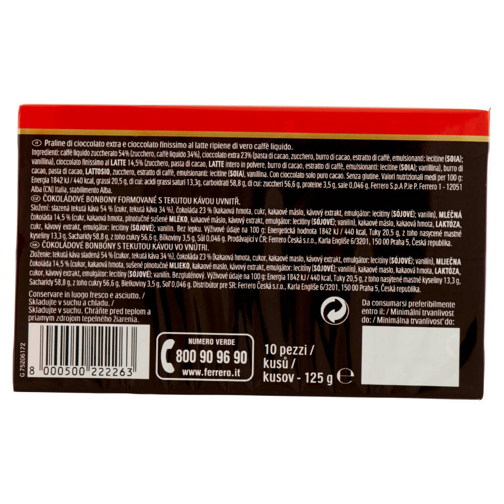 Caffè liquido zuccherato 54% (zucchero, caffè liquido 34%) Cioccolato extra 23% (pasta di cacao, zucchero, burro di cacao, estratto di caffè, emulsionanti: lecitine (soia); vanillina) Cioccolato finissimo al latte 14,5% (zucchero, pasta di cacao, latte intero in polvere, burro di cacao, estratto di caffè, emulsionanti: lecitine (soia); vanillina) Burro di cacao Pasta di cacao Lattosio Zucchero Estratto di caffè Emulsionanti: lecitine (soia) Vanillina Con cioccolato solo puro cacao Senza glutine