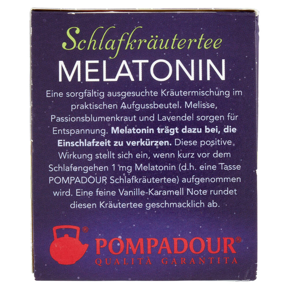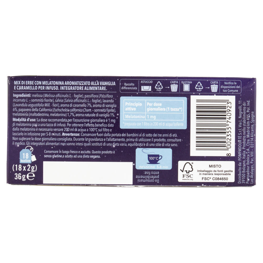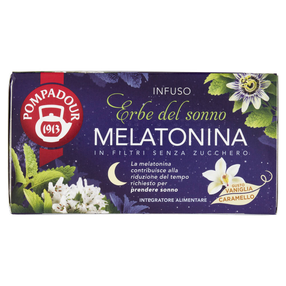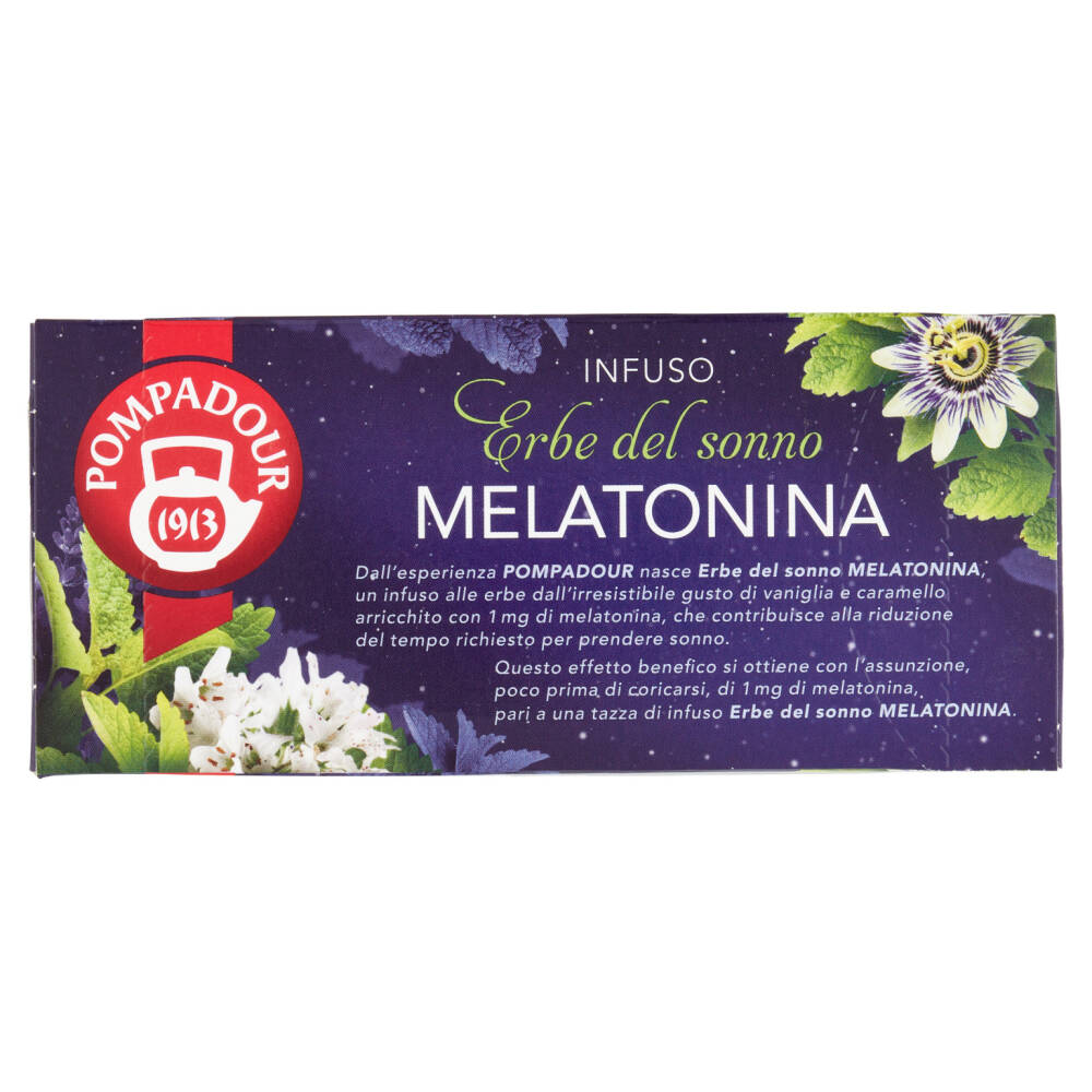Dall'esperienza Pompadour nasce Erbe del sonno Melatonina, un infuso alle erbe dall'irresistibile gusto di vaniglia e caramello arricchito con 1 mg di melatonina, che contribuisce alla riduzione del tempo richiesto per prendere sonno.