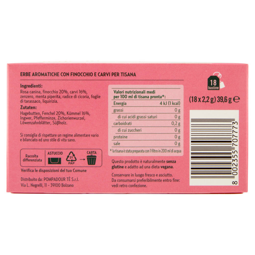 Rosa canina Finocchio 20% Carvi 16% Zenzero Menta piperita Radice di cicoria Foglie di tarassaco Liquirizia