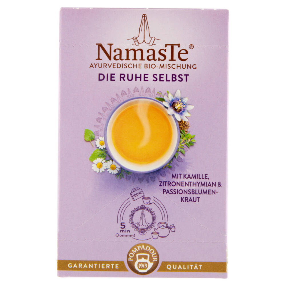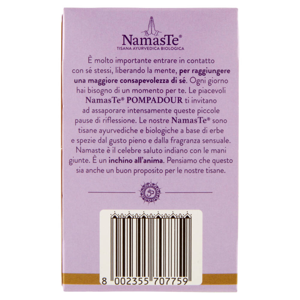 È molto importante entrare in contatto con sé stessi, liberando la mente, per raggiungere una maggiore consapevolezza di sé. Ogni giorno hai bisogno di un momento per te. Le piacevoli NamasTe Pompadour ti invitano ad assaporare intensamente queste piccole pause di riflessione. Le nostre NamasTe sono tisane ayurvediche e biologiche a base di erbe e spezie dal gusto pieno e dalla fragranza sensuale. Namaste è il celebre saluto indiano con le mani giunte. È un inchino all'anima. Pensiamo che questo sia anche un buon proposito per le nostre tisane.
