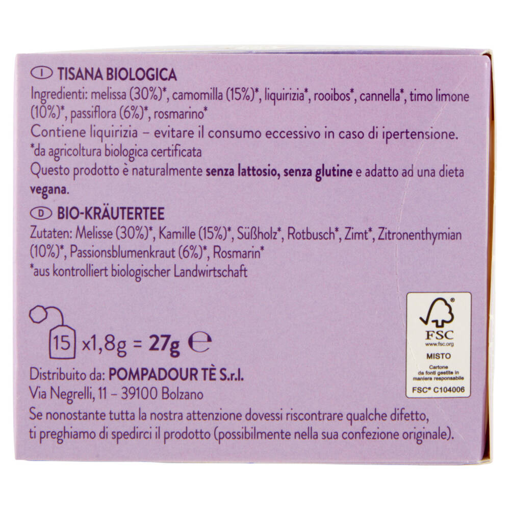 Melissa (30%)* Camomilla (15%)* Liquirizia* Rooibos* Cannella* Timo limone (10%)* Passiflora (6%)* Rosmarino* Contiene liquirizia - evitare il consumo eccessivo in caso di ipertensione *da agricoltura biologica certificata Questo prodotto è naturalmente senza lattosio, senza glutine e adatto ad una dieta vegana