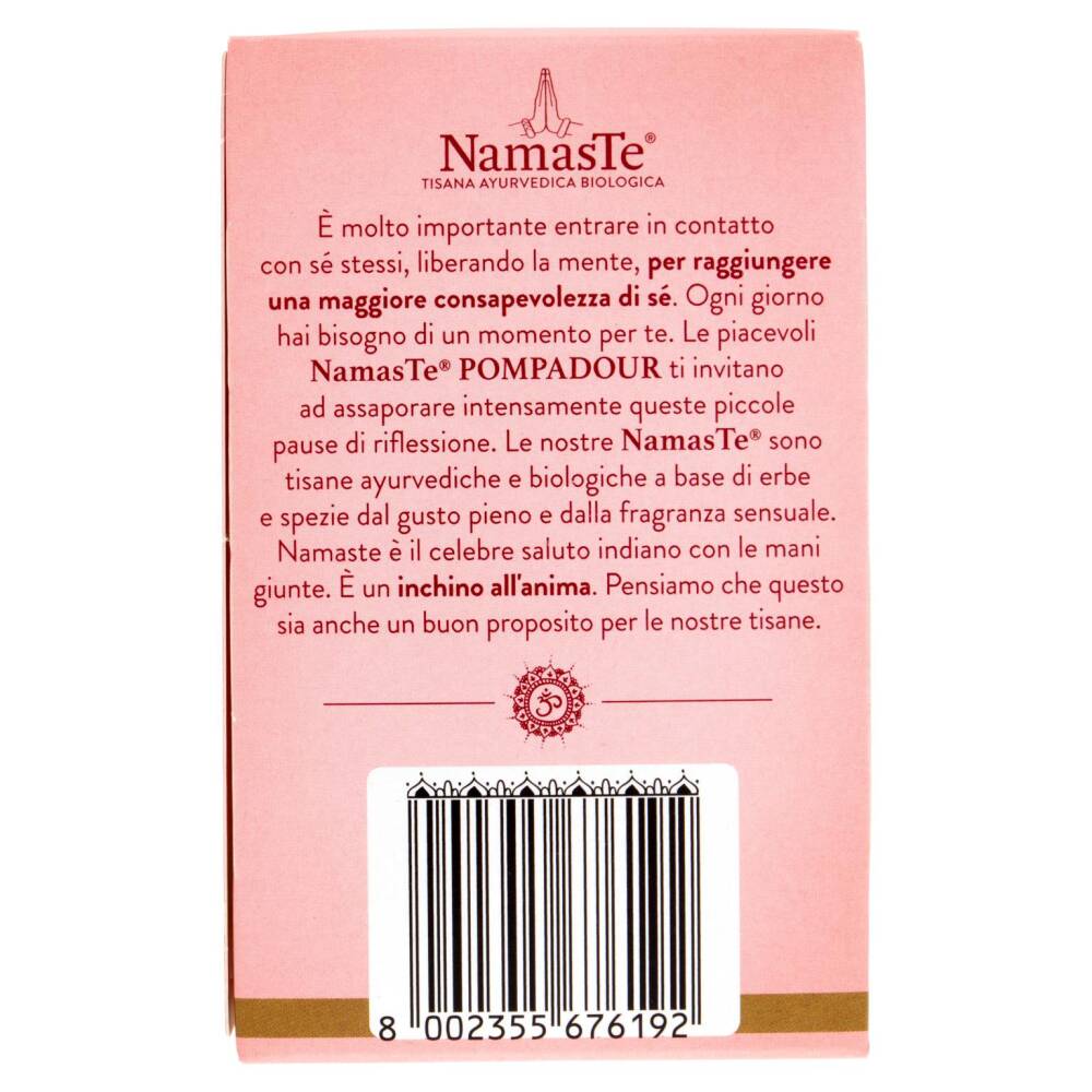 È molto importante entrare in contatto con sé stessi, liberando la mente, per raggiungere una maggiore consapevolezza di sé. Ogni giorno hai bisogno di un momento per te. Le piacevoli NamasTe Pompadour ti invitano ad assaporare intensamente queste piccole pause di riflessione. Le nostre NamasTe sono tisane ayurvediche e biologiche a base di erbe e spezie dal gusto pieno e dalla fragranza sensuale. Namaste è il celebre saluto indiano con le mani giunte. È un inchino all'anima. Pensiamo che questo sia anche un buon proposito per le nostre tisane.