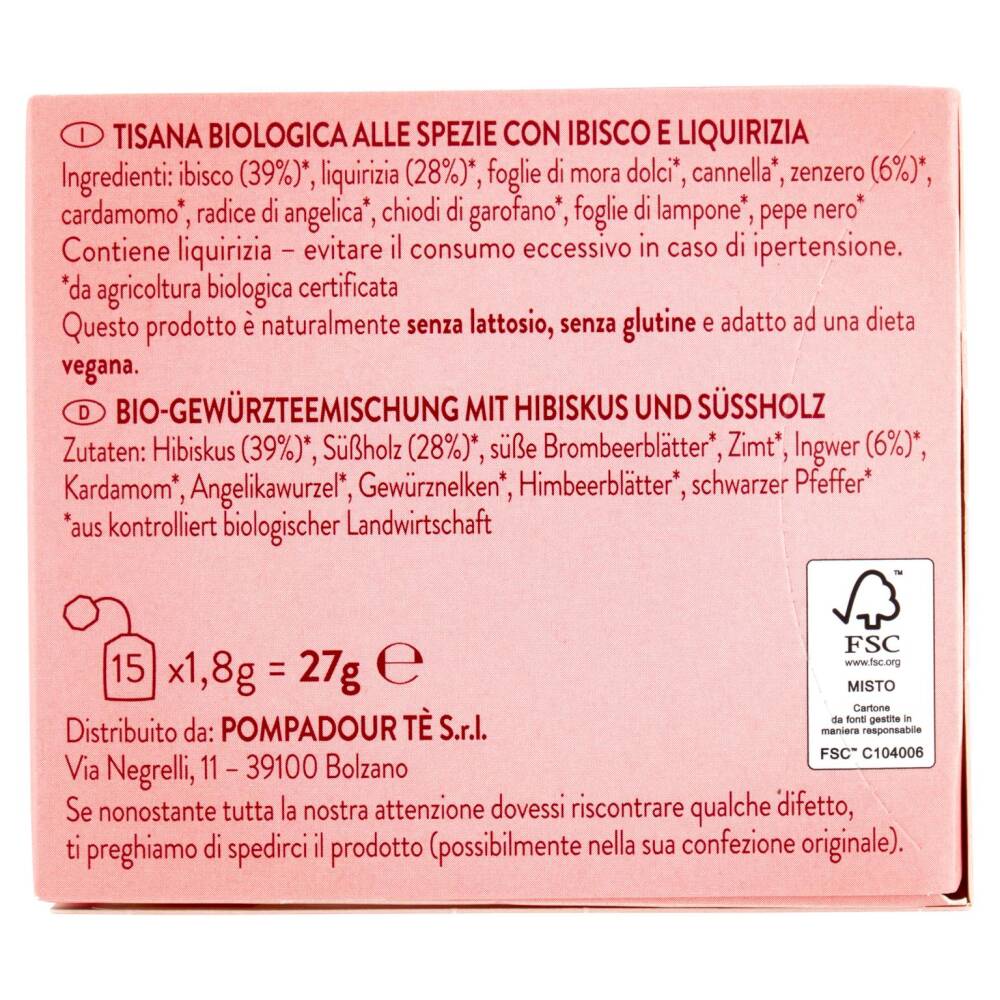 Ibisco (39%)* Liquirizia (28%)* Foglie di mora dolci* Cannella* Zenzero (6%)* Cardamomo* Radice di angelica* Chiodi di garofano* Foglie di lampone* Pepe nero* Contiene liquirizia - evitare il consumo eccessivo in caso di ipertensione *da agricoltura biologica certificata Questo prodotto è naturalmente senza lattosio, senza glutine e adatto ad una dieta vegana