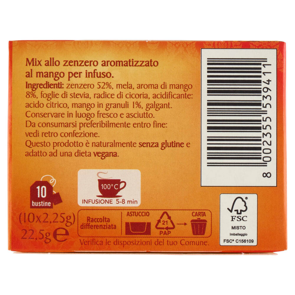 Una deliziosa composizione che unisce il sapore piccante dello zenzero all'aroma dolce del mango. Un infuso dal gusto piacevole e speziato, ideale in qualsiasi momento della giornata.