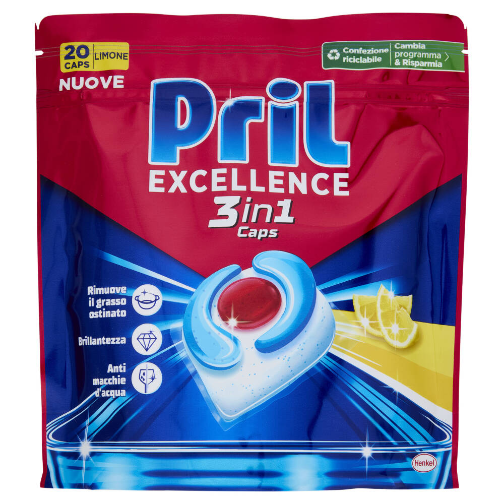 sono caps per lavastoviglie a rapida dissoluzione con una formula che assicura pulizia profonda contro il grasso ostinato anche con cicli brevi e eco a basse temperature. Pril Excellence 3in1 Caps inoltre previene la formazione di aloni d'acqua per una brillantezza eccellente di stoviglie e bicchieri.