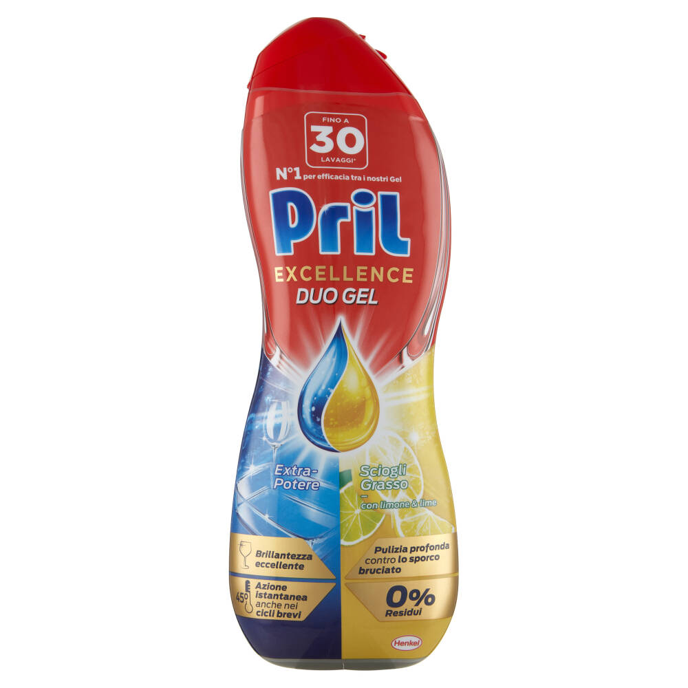 Fino a 30 lavaggi* N°1 per efficacia tra i nostri Gel Extra-Potere Sciogli Grasso - con limone & lime Brillantezza eccellente Pulizia profonda contro lo sporco bruciato 45° -Azione istantanea anche nei cicli brevi 0% Residui *Riferito al dosaggio raccomandato di Pril Excellence Duo Gel (piatti poco sporchi)
