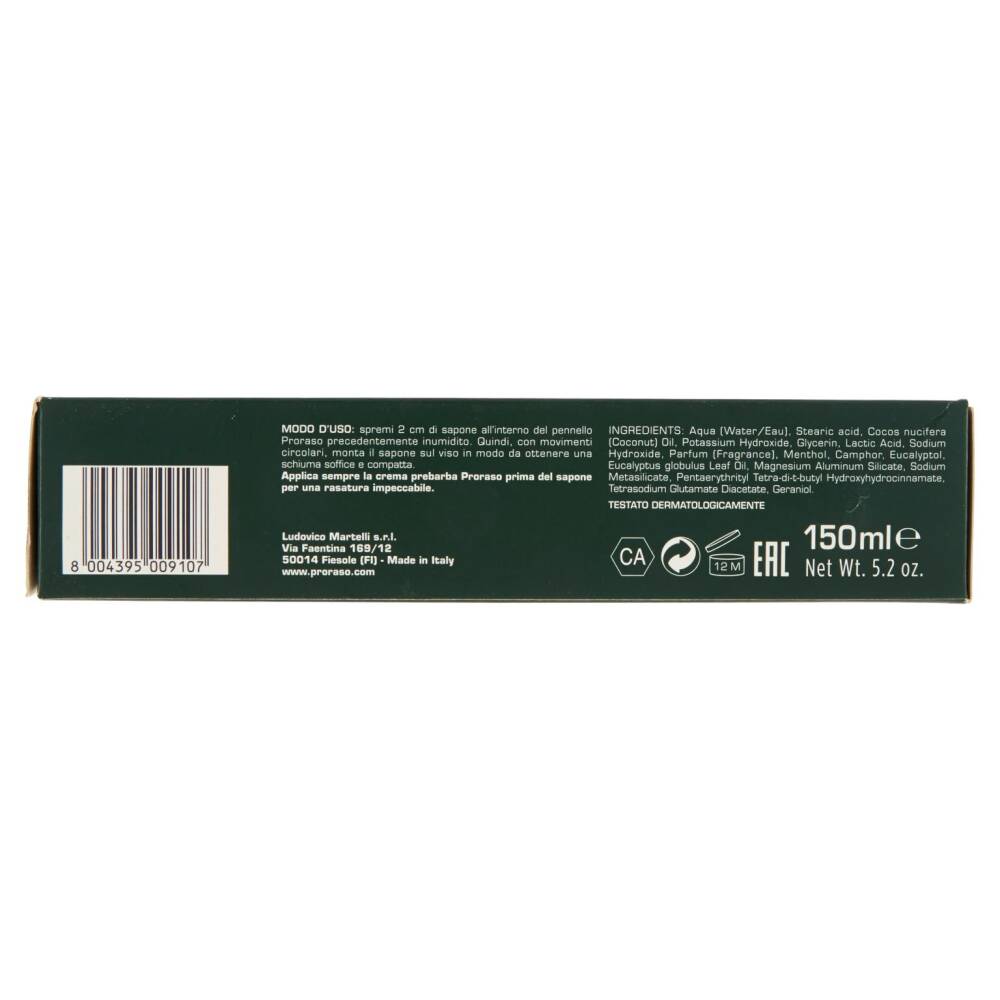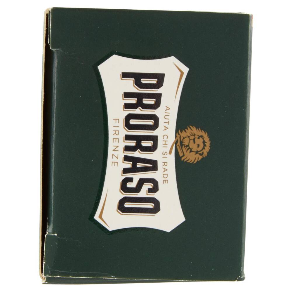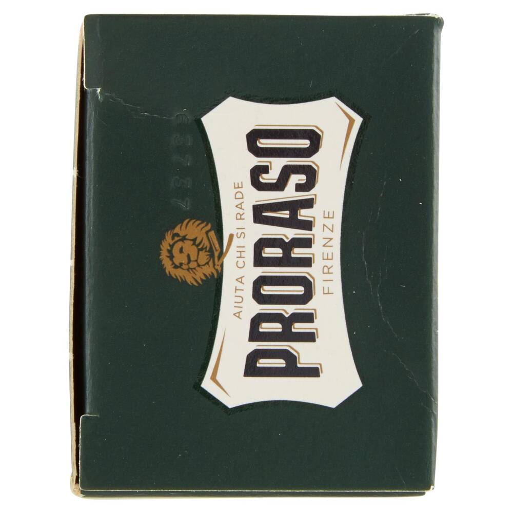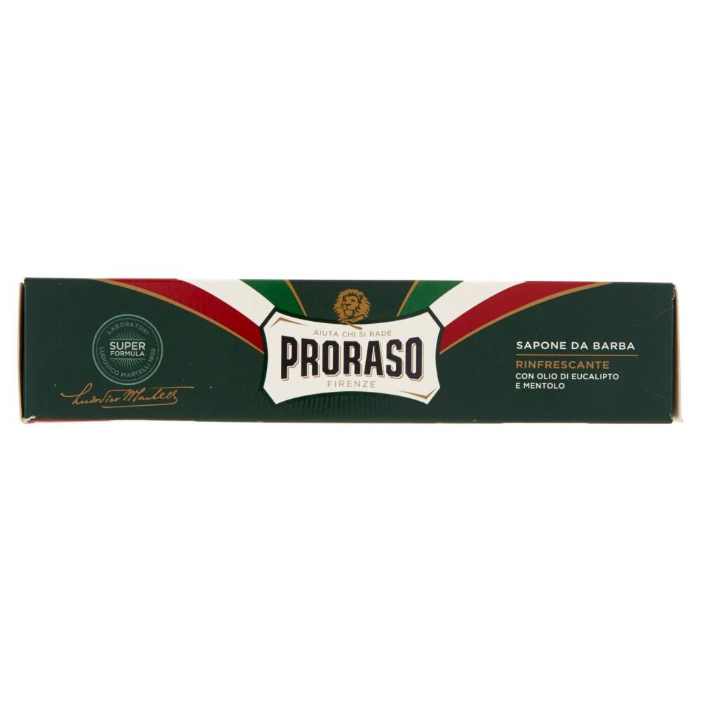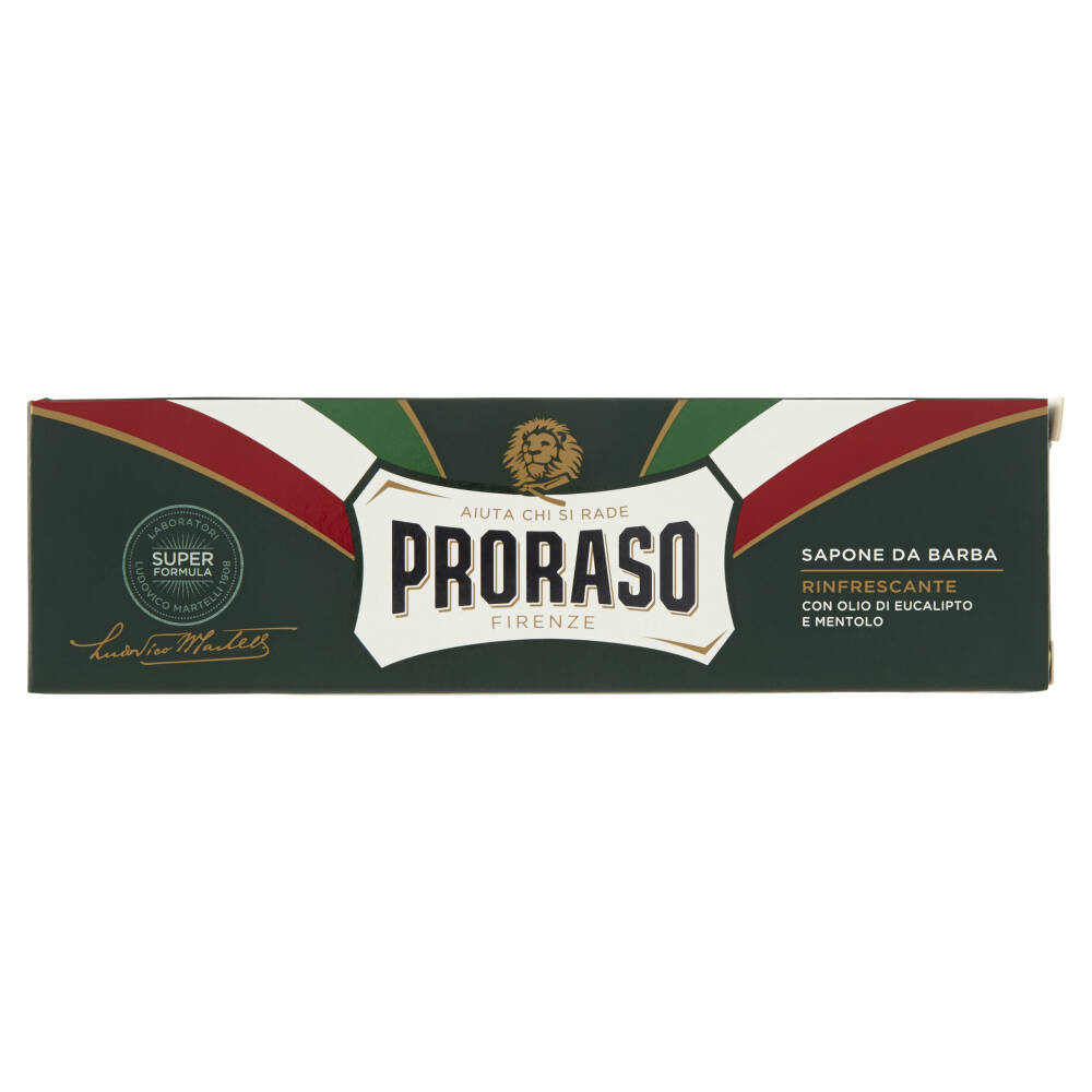 Sapone da Barba: il grande classico della rasatura. È prodotto ancora oggi con il rigore del processo produttivo della "saponificazione a caldo" che consente di trasformare gli ingredienti di origine naturale in sapone estremamente fine, ricco e concentrato. Super Formula: grazie alla costante innovazione dei Laboratori Ludovico Martelli, nasce la nuova Super Formula del Sapone da Barba Proraso. Adatto per qualsiasi tipo di barba, combina una perfetta protezione della pelle alla facilità di rasatura anche dei peli duri e difficili da tagliare. La speciale combinazione di componenti emollienti e idratanti rende il rito della rasatura un piacere giornaliero irrinunciabile. Rinfrescante: arricchita di estratti naturali, Olio di Eucalipto e Mentolo, è studiata per donare un'incredibile sensazione di freschezza e tonicità alla pelle appena rasata.
