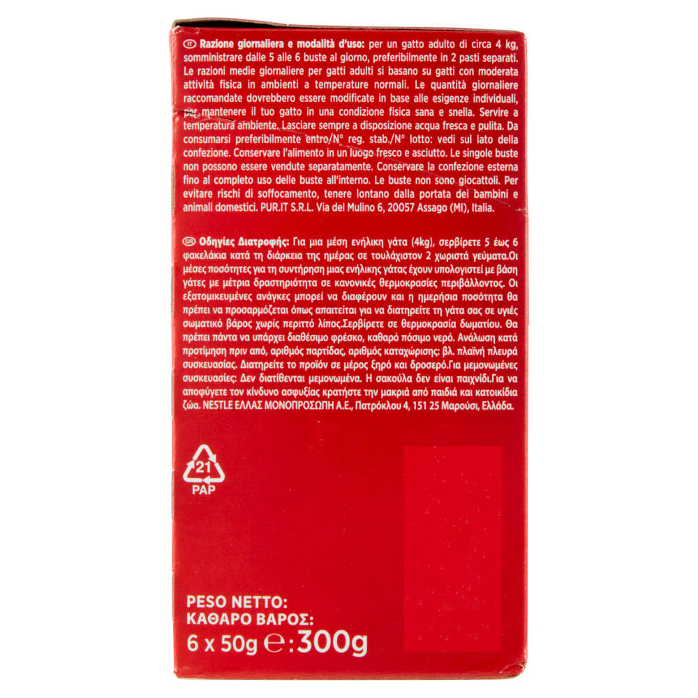 Razione giornaliera e modalità d'uso: per un gatto adulto di circa 4 kg, somministrare dalle 5 alle 6 buste al giorno, preferibilmente in 2 pasti separati. Le razioni medie giornaliere per gatti adulti si basano su gatti con moderata attività fisica in ambienti a temperature normali. Le quantità giornaliere raccomandate dovrebbero essere modificate in base alle esigenze individuali, per mantenere il tuo gatto in una condizione fisica sana e snella. Servire a temperatura ambiente. Lasciare sempre a disposizione acqua fresca e pulita.