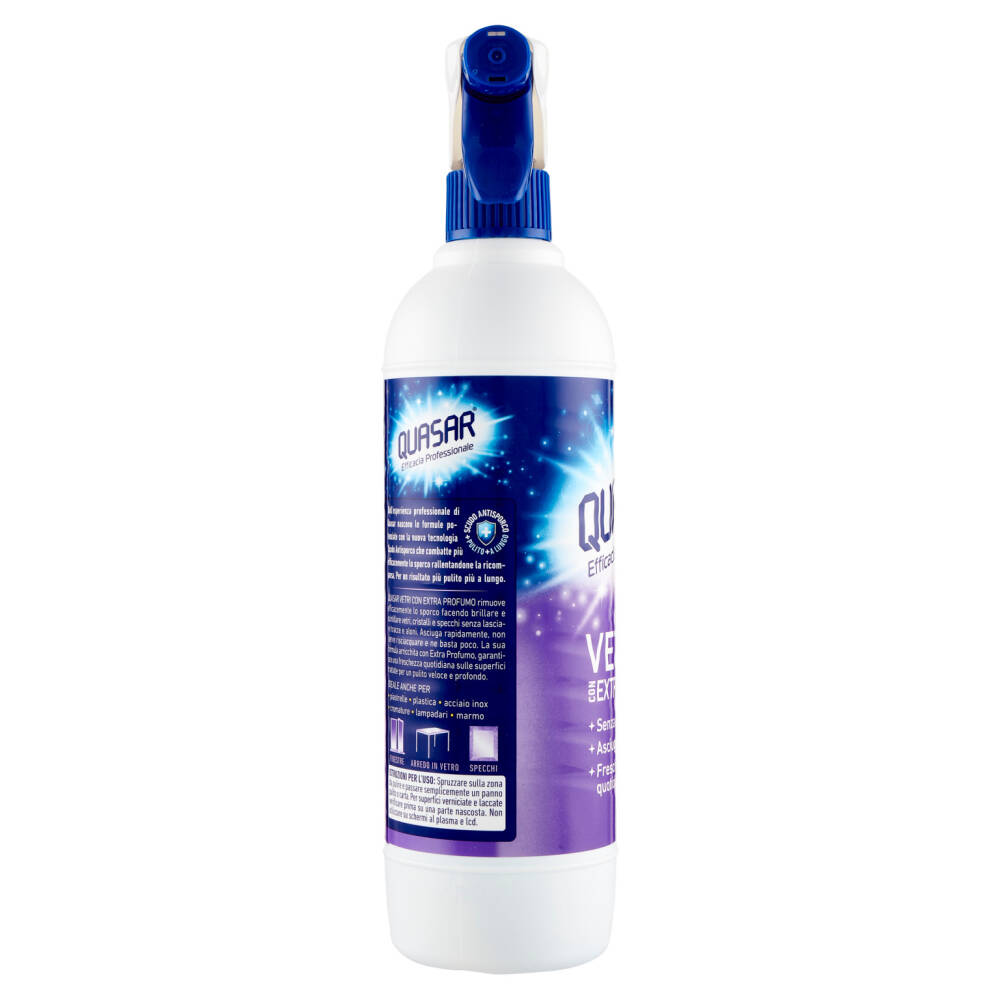 Quasar Vetri con Extra Profumo rimuove efficacemente lo sporco facendo brillare e scintillare vetri, cristalli e specchi senza lasciare tracce e aloni. Asciuga rapidamente, non serve risciacquare e ne basta poco. La sua formula arricchita con Extra Profumo, garantisce una freschezza quotidiana sulle superfici trattate per un pulito veloce e profondo.