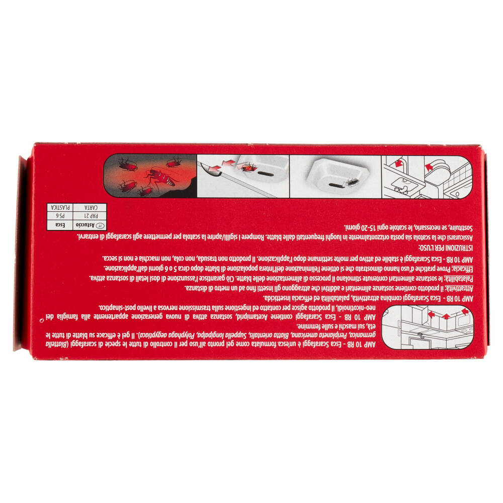 AMP 10 RB - Esca Scarafaggi è un'esca formulata come gel pronto all'uso per il controllo di tutte le specie di scarafaggi (Blattella germanica, Periplaneta americana, Blatta orientalis, Suppella longipalpa, Polyphaga aegyptiaca). Il gel è efficace su blatte di tutte le età, sui maschi e sulle femmine.