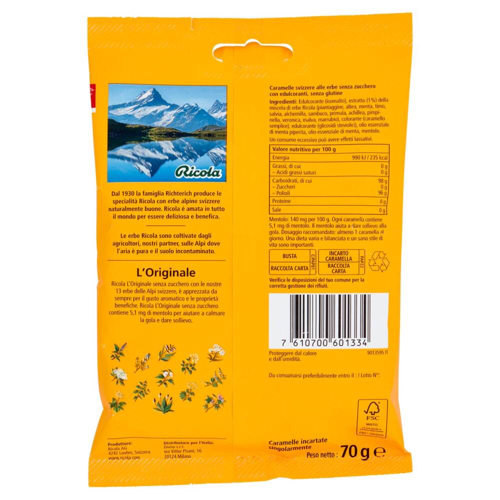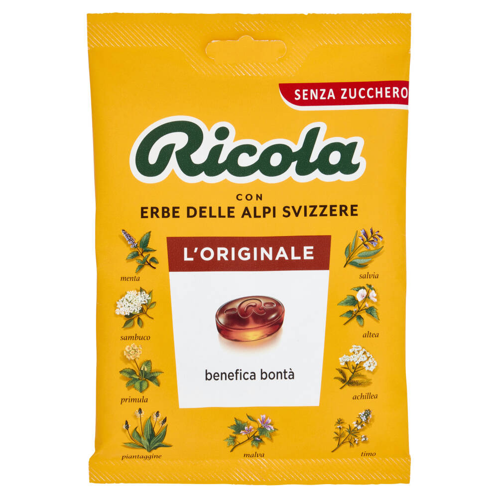 Ricola L'Originale senza zucchero con le nostre 13 erbe delle Alpi svizzere, è apprezzata da sempre per il gusto aromatico e le proprietà benefiche. Ricola L'Originale senza zucchero contiene 5,1 mg di mentolo per aiutare a calmare la gola e dare sollievo.