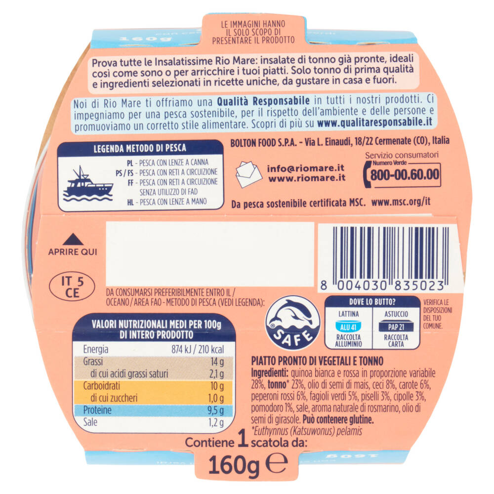 Quinoa bianca e rossa in proporzione variabile 28% Tonno* 23% Olio di semi di mais Ceci 8% Carote 6% Peperoni rossi 6% Fagioli verdi 5% Piselli 3% Cipolle 3% Pomodoro 1% Sale Aroma naturale di rosmarino Olio di semi di girasole Può contenere glutine *Euthynnus (Katsuwonus) pelamis