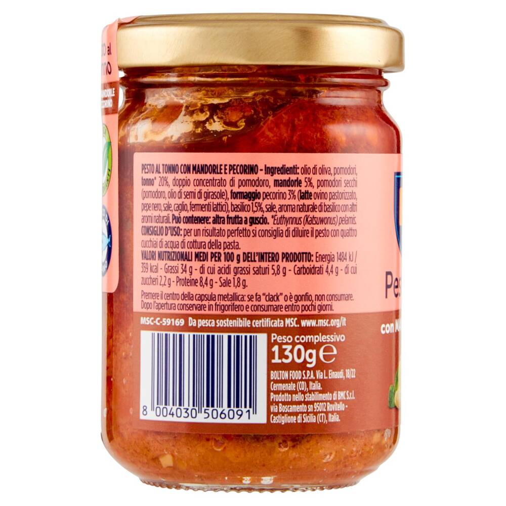 Olio di oliva Pomodori Tonno* 20% Doppio concentrato di pomodoro Mandorle 5% Pomodori secchi (pomodoro, olio di semi di girasole) Formaggio pecorino 3% (latte ovino pastorizzato, pepe nero, sale, caglio, fermenti lattici) Basilico 1,5% Sale Aroma naturale di basilico con altri aromi naturali Può contenere: altra frutta a guscio *Euthynnus (Katsuwonus) pelamis