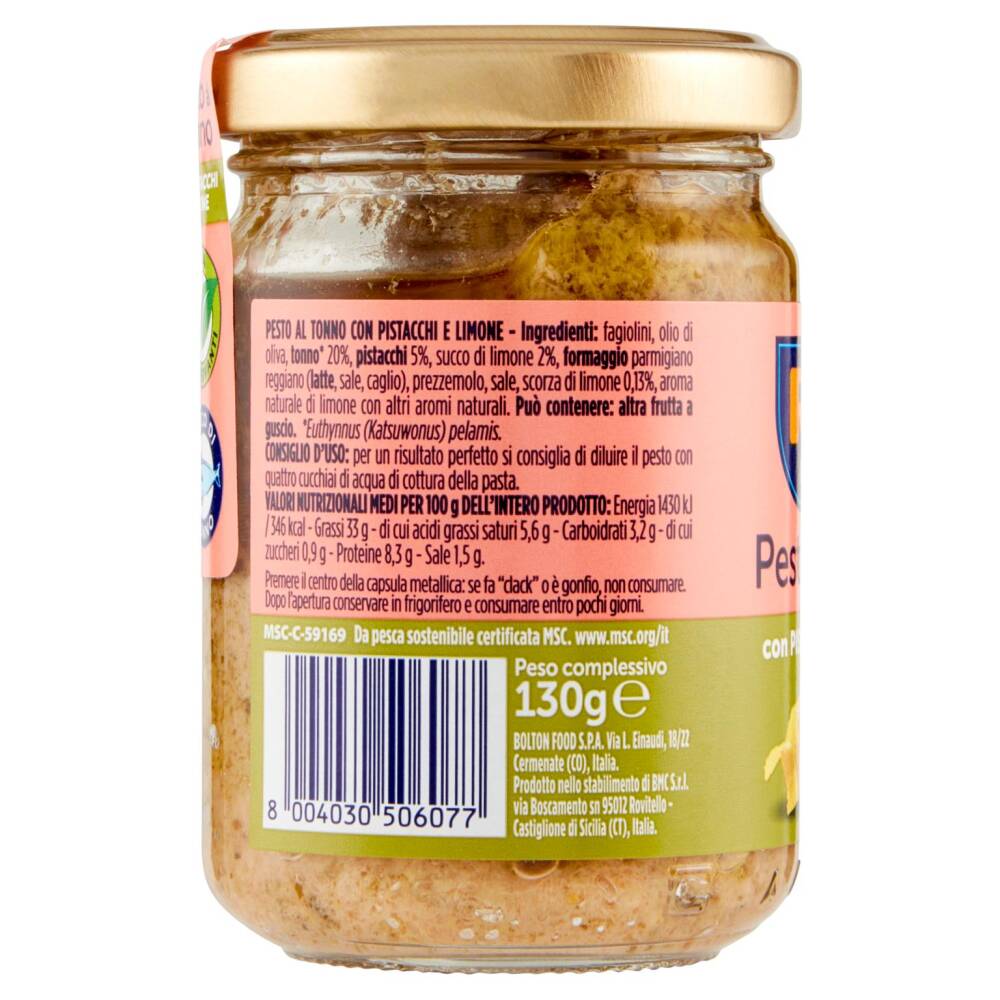 Fagiolini Olio di oliva Tonno* 20% Pistacchi 5% Succo di limone 2% Formaggio parmigiano reggiano (latte, sale, caglio) Prezzemolo Sale Scorza di limone 0,13% Aroma naturale di limone con altri aromi naturali Può contenere: altra frutta a guscio *Euthynnus (Katsuwonus) pelamis