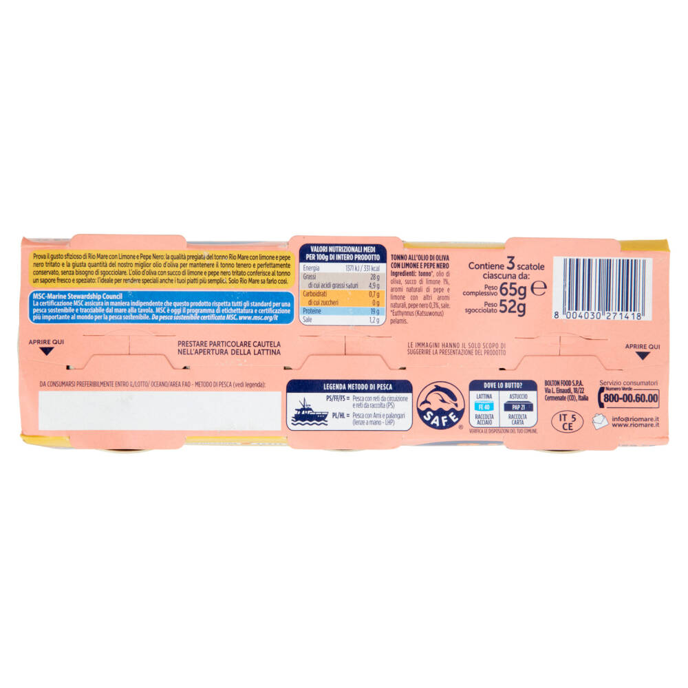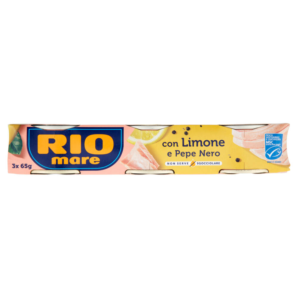 Prova il gusto sfizioso di Rio Mare con Limone e Pepe Nero: la qualità pregiata del tonno Rio Mare con limone e pepe nero tritato e la giusta quantità del nostro miglior olio d'oliva per mantenere il tonno tenero e perfettamente conservato, senza bisogno di sgocciolare. L'olio d'oliva con succo di limone e pepe nero tritato conferisce al tonno un sapore fresco e speziato: l'ideale per rendere speciali anche i tuoi piatti più semplici. Solo Rio Mare sa farlo così.