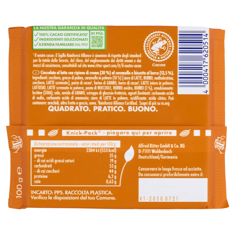 Cioccolato al latte con ripieno di crema (30 %) al caramello e biscotto al burro (13,5 %)