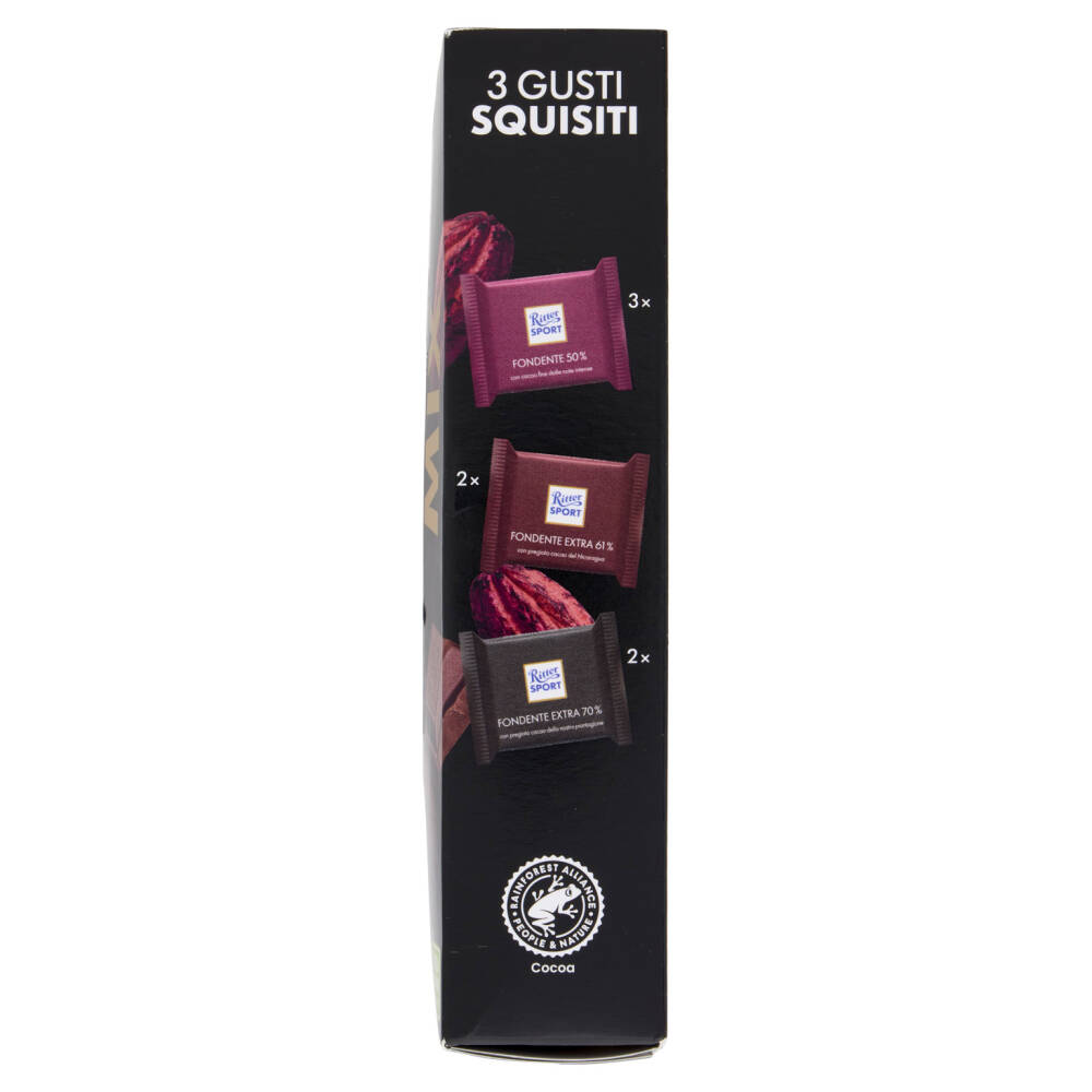 Assortimento di cioccolato: Cioccolato fondente, cacao: 50 % minimo. Cioccolato fondente extra fine, cacao: 61 % minimo. Cioccolato fondente extra fine, cacao: 70 % minimo