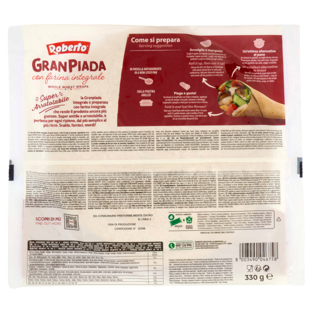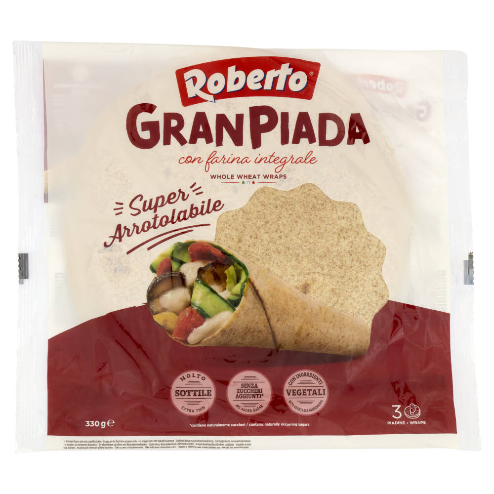 la Granpiada integrale è preparata con farina integrale che rende il prodotto ancora più gustoso. Super sottile e arrotolabile, è perfetta per ogni ripieno, dal più semplice al più ricco. Scalda, farcisci, mordi!