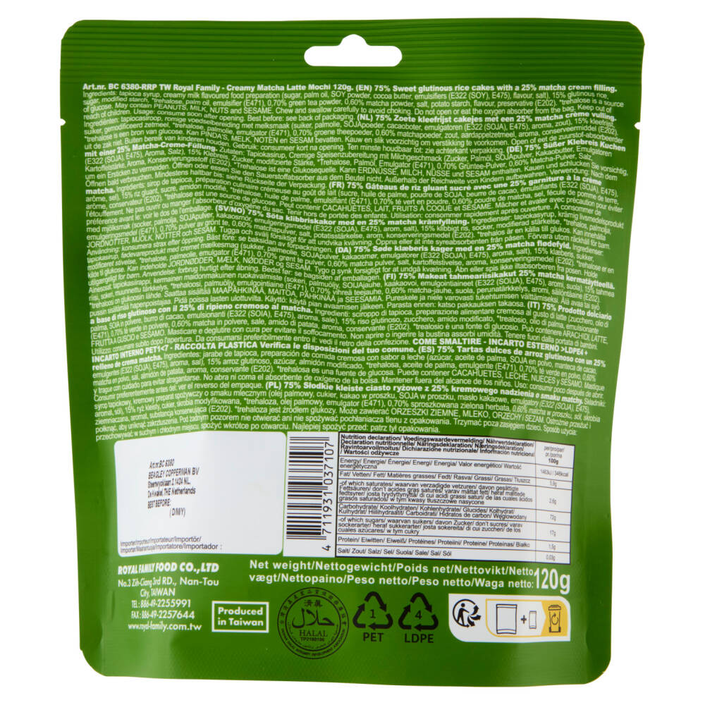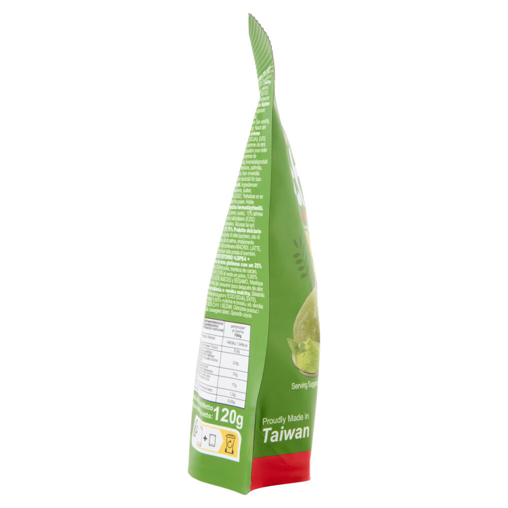 Sciroppo di tapioca Preparazione alimentare cremosa al gusto di latte (zucchero, olio di palma, soia in polvere, burro di cacao, emulsionanti (E322 (soia), E475), aroma, sale) 15% Riso glutinoso Zucchero Amido modificato *Trealosio Olio di palma Emulsionante (E471) 0,70% Tè verde in polvere 0,60% Matcha in polvere Sale Amido di patata Aroma Conservante (E202) *trealosio è una fonte di glucosio Può contenere arachidi, latte, frutta a guscio e sesamo