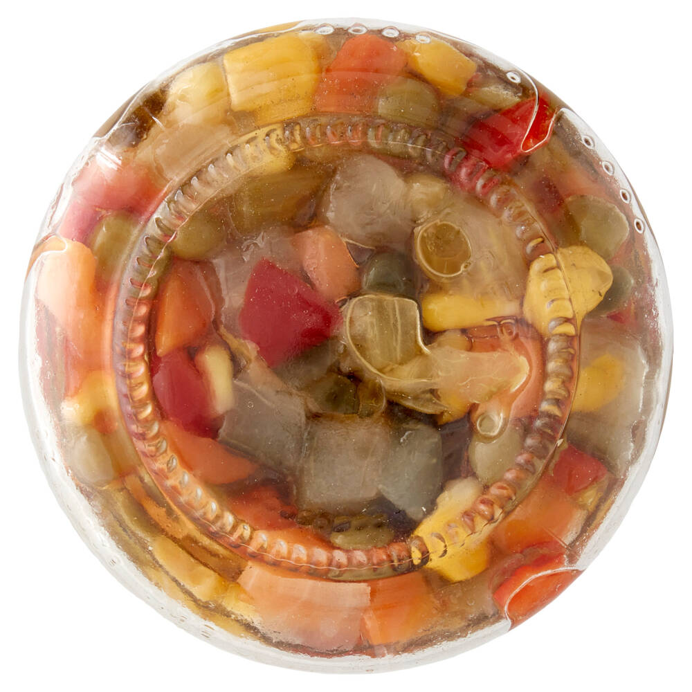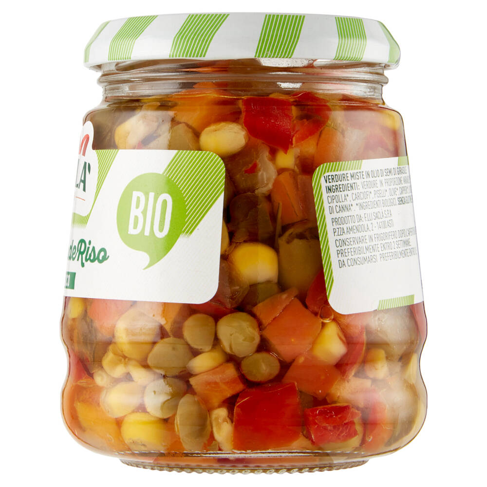 Verdure in proporzione variabile* 57% (carote*, peperoni*, cetrioli*, mais*, sedano*, cipolla*, carciofi*, piselli*, olive*, capperi*) Olio di semi di girasole* 40% Aceto di vino* Sale Zucchero di canna* *Ingredienti biologici Senza glutine Può contenere noccioli o frammenti di noccioli