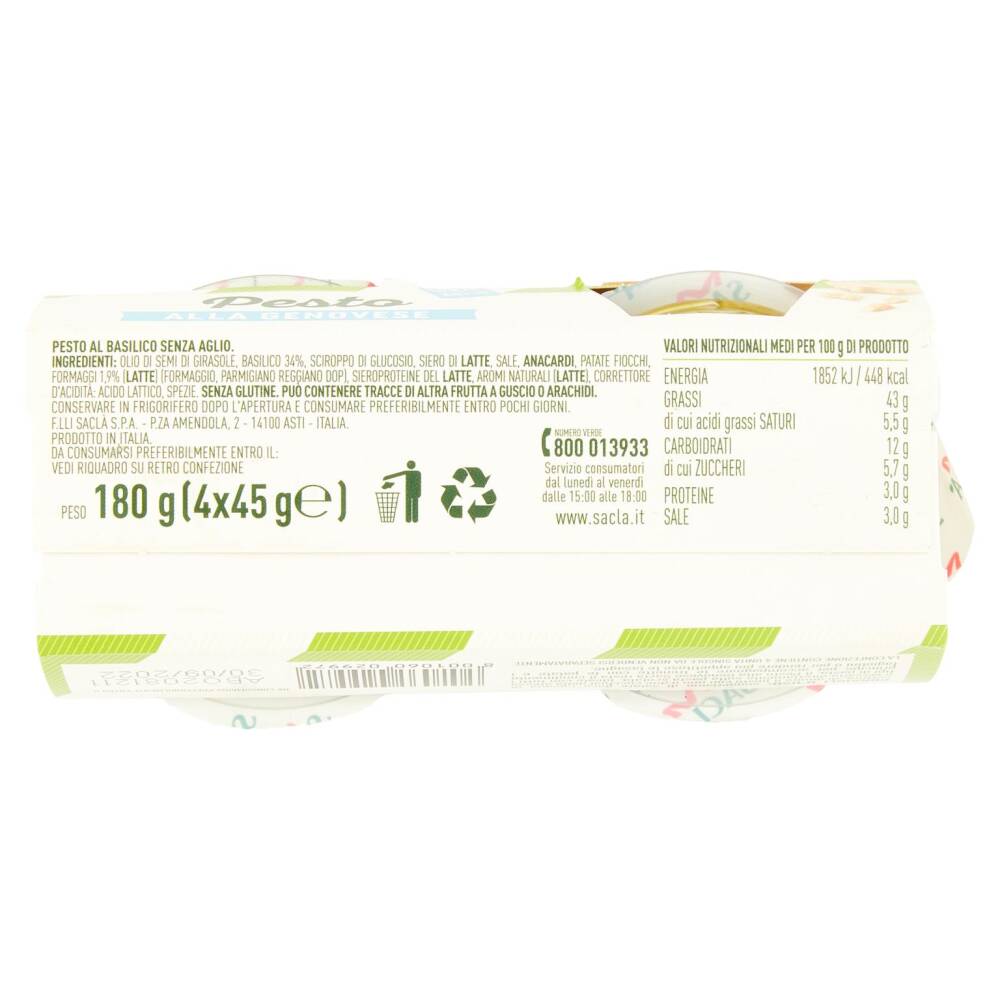 Olio di semi di girasole Basilico 34% Sciroppo di glucosio Siero di latte Sale Anacardi Patate fiocchi Formaggi 1,9% (latte) (formaggio, Parmigiano Reggiano DOP) Sieroproteine del latte Aromi naturali (latte) Correttore d'acidità: acido lattico Spezie Senza glutine Può contenere tracce di altra frutta a guscio o arachidi
