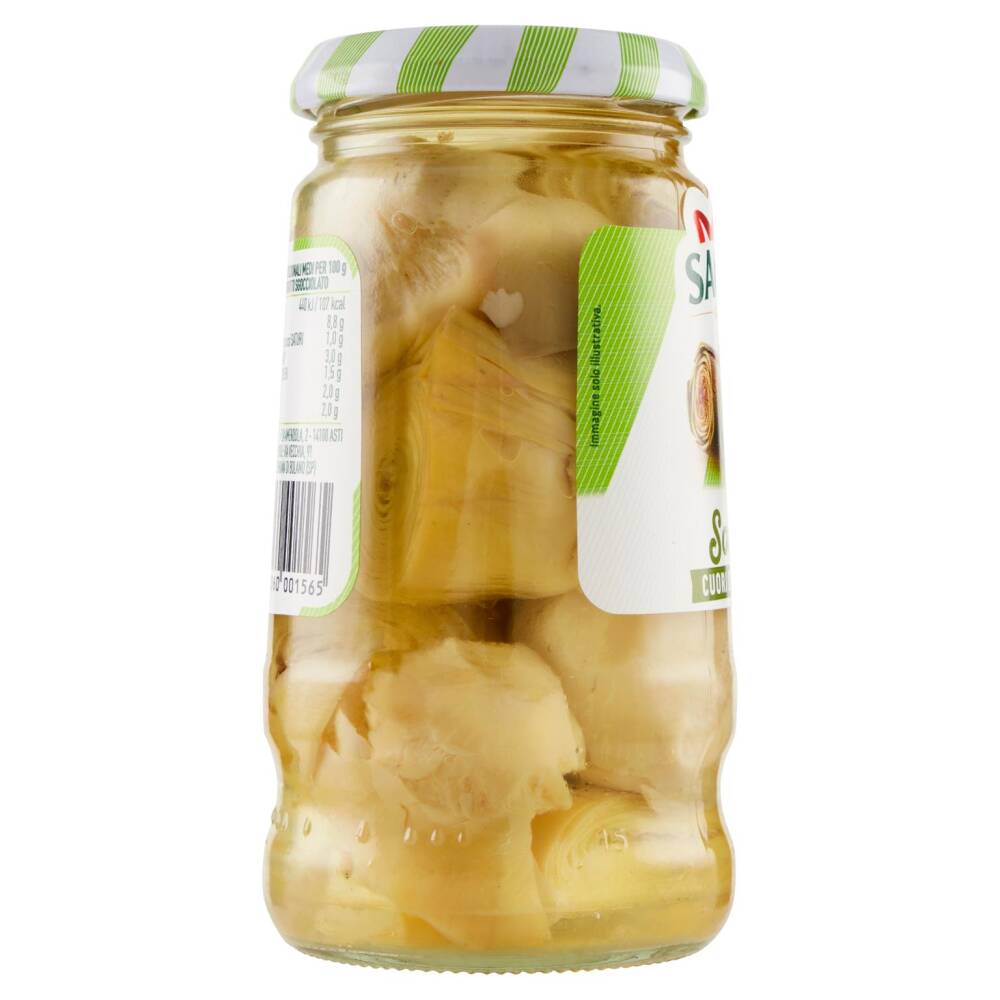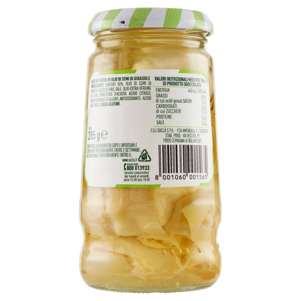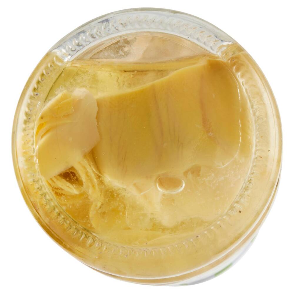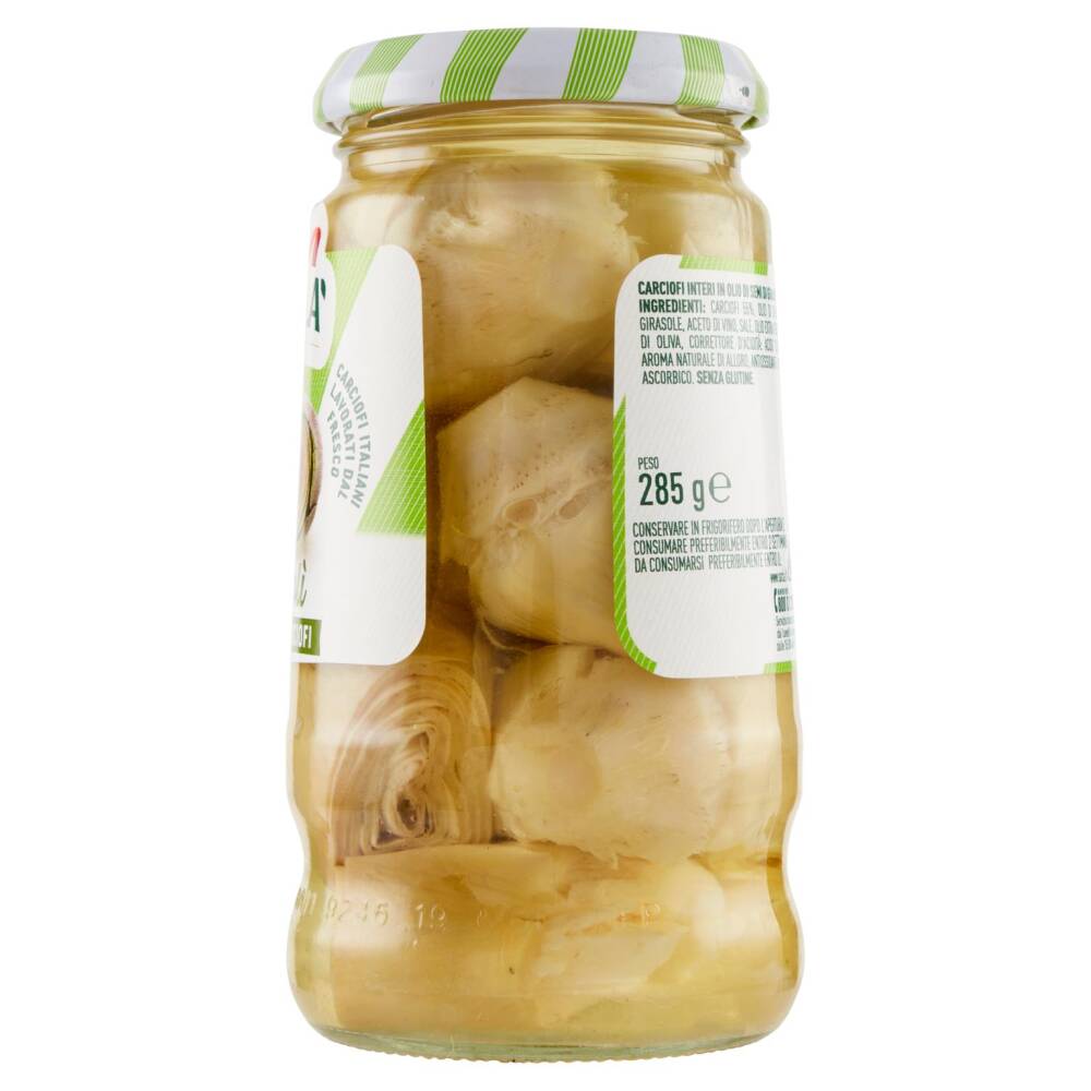 Carciofi 55% Olio di semi di girasole Aceto di vino Sale Olio extra vergine di oliva Correttore d'acidità: acido citrico Aroma naturale di alloro Antiossidante: acido ascorbico Senza glutine