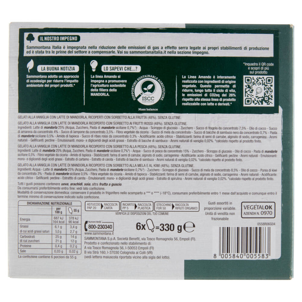 Gelati alla vaniglia con latte di mandorla, ricoperti con sorbetto alla frutta (48%). Senza glutine