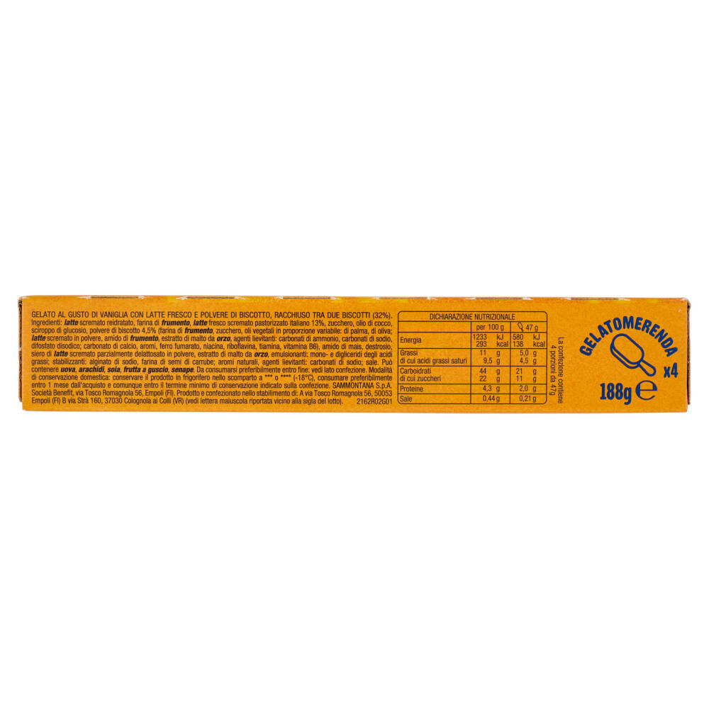 Polvere di biscotto 4,5% (farina di frumento, zucchero, oli vegetali in proporzione variabile: di palma, di oliva; latte scremato in polvere, amido di frumento, estratto di malto da orzo, agenti lievitanti: carbonati di ammonio, carbonati di sodio, difosfato disodico; carbonato di calcio, aromi, ferro fumarato, niacina, riboflavina, tiamina, vitamina B6)