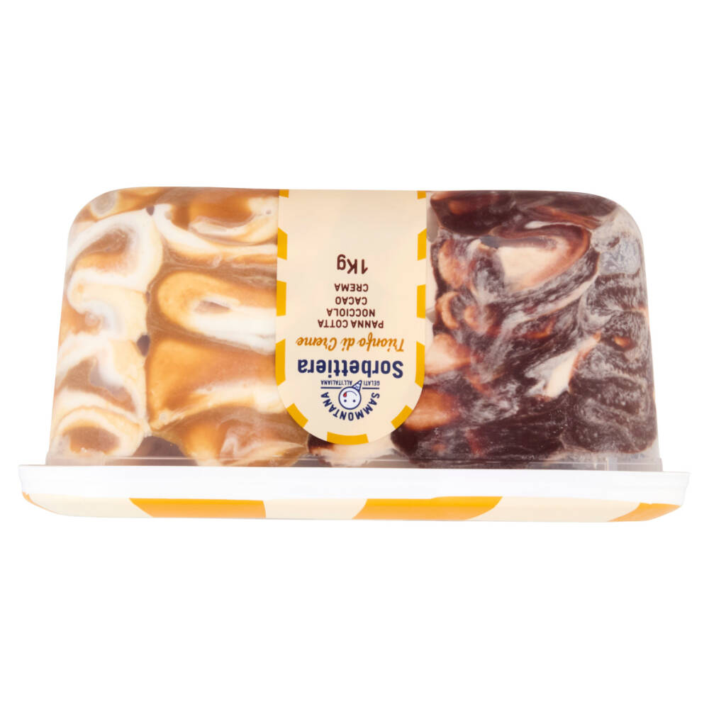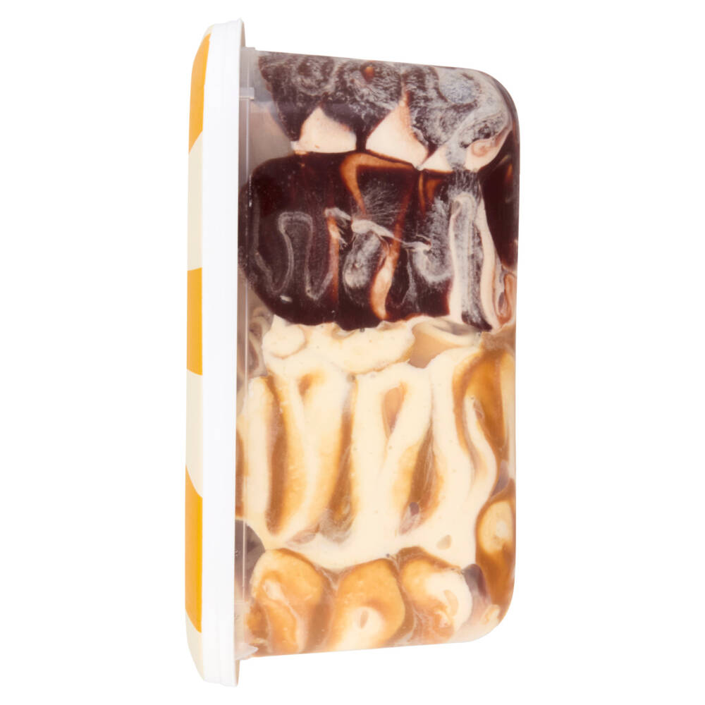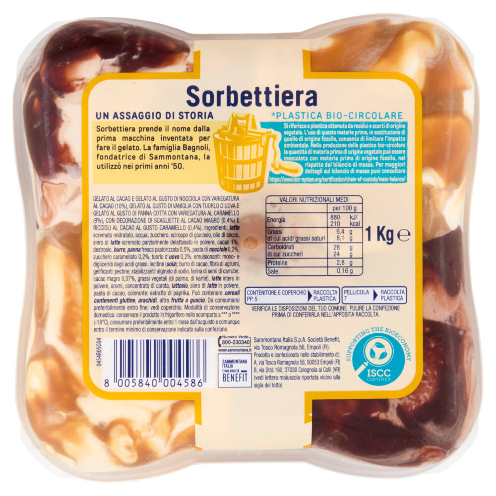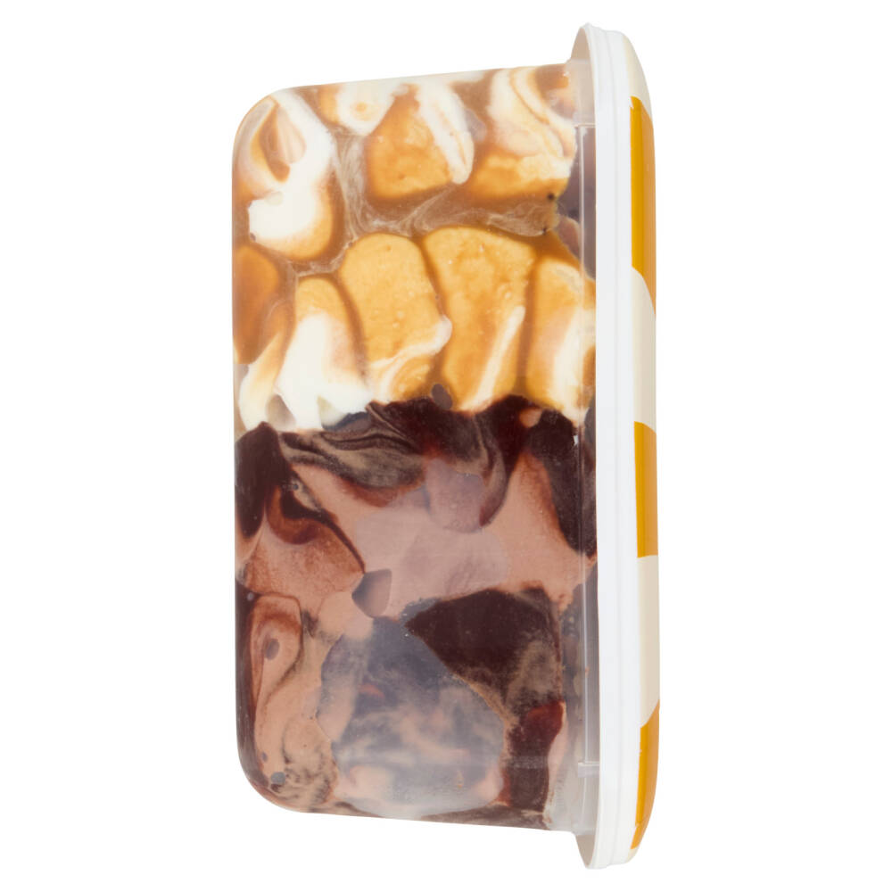 Gelato al cacao e gelato al gusto di nocciola con variegatura al cacao (10%), gelato al gusto di vaniglia con tuorlo d'uova e gelato al gusto di panna cotta con variegatura al caramello (9%), con decorazione di scagliette al cacao magro (0,4%) e riccioli al cacao al gusto caramello (0,4%)