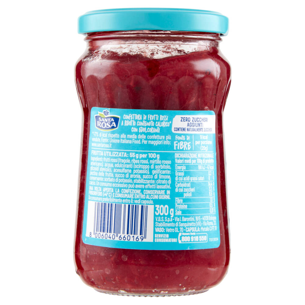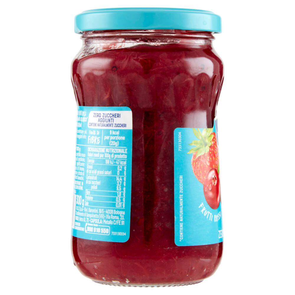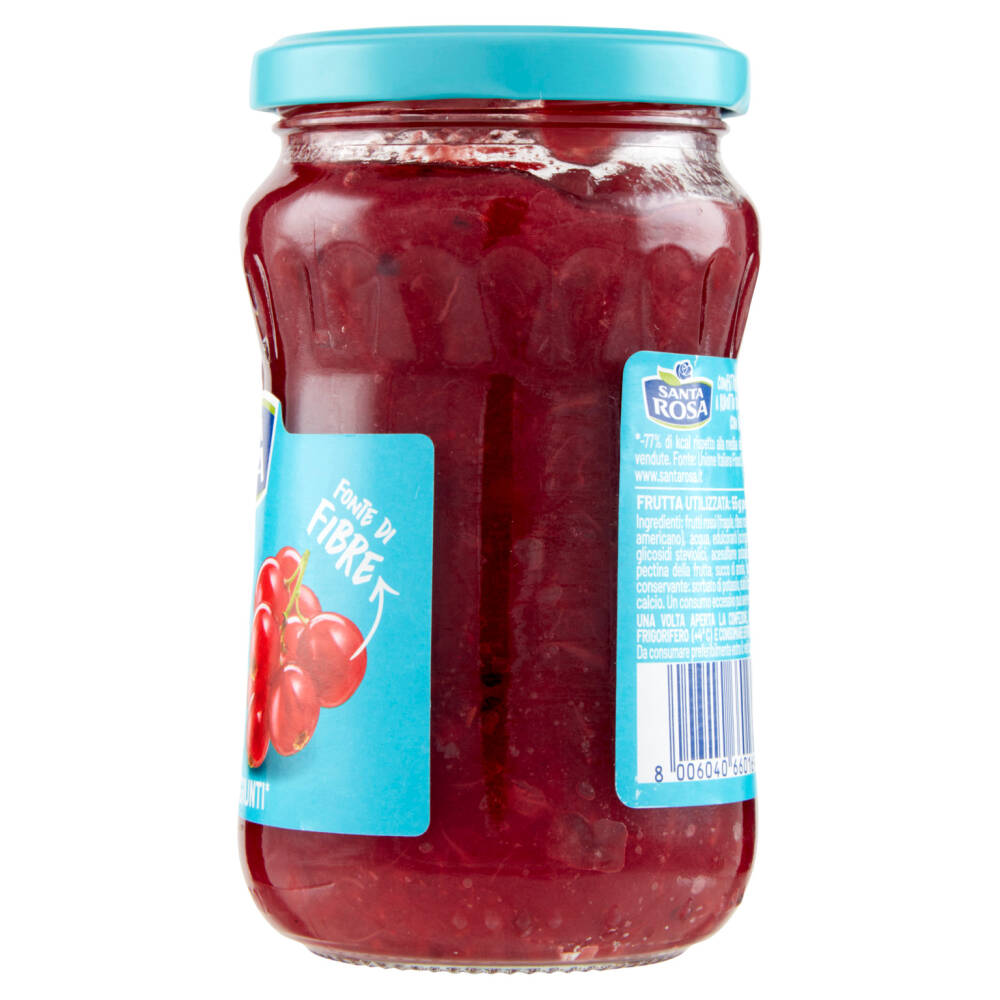Frutti rossi (fragole, ribes rossi, mirtillo rosso americano) Acqua Edulcoranti (sciroppo di sorbitolo, glicosidi steviolici, acesulfame potassio) Gelificante: pectina della frutta Succo di aronia Succo di limone Conservante: sorbato di potassio Stabilizzante: citrato di calcio Un consumo eccessivo può avere effetti lassativi Frutta utilizzata: 55 g per 100 g