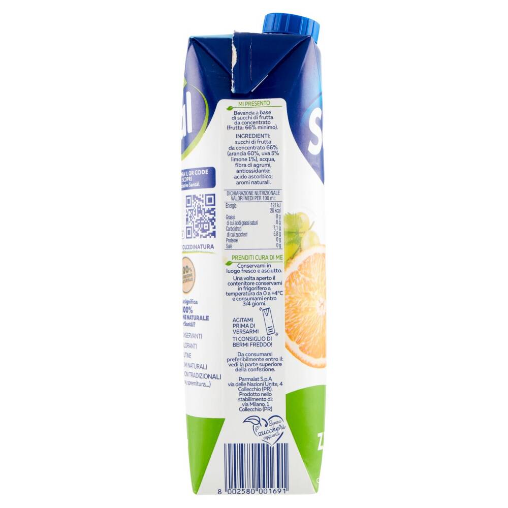Succhi di frutta da concentrato 66% (arancia 60%, uva 5%, limone 1%) Acqua Fibra di agrumi Antiossidante: acido ascorbico Aromi naturali