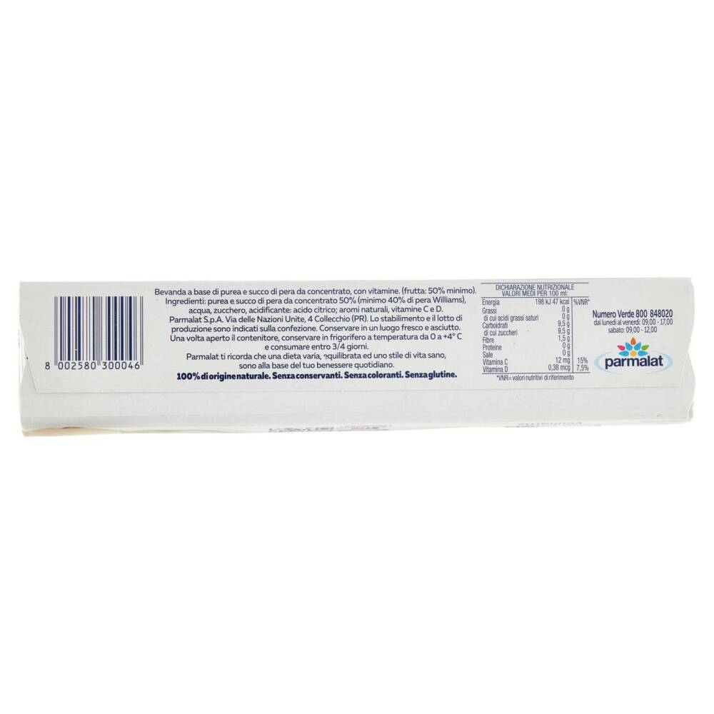 Purea e succo di pera da concentrato 50% (minimo 40% di pera Williams) Acqua Zucchero Acidificante: acido citrico Aromi naturali Vitamine C e D
