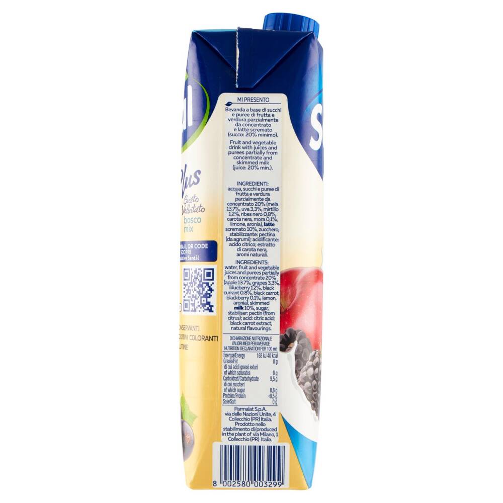 Acqua Succhi e puree di frutta e verdura parzialmente da concentrato 20% (mela 13,7%, uva 3,3%, mirtillo 1,2%, ribes nero 0,8%, carota nera, mora 0,1%, limone, aronia) Latte scremato 10% Zucchero Stabilizzante: pectina (da agrumi) Acidificante: acido citrico Estratto di carota nera Aromi naturali