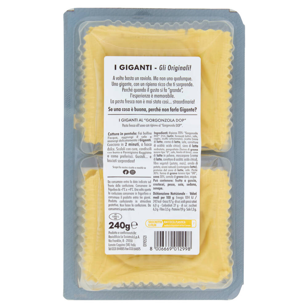 Ripieno 70%: "Gorgonzola DOP" 25% (latte, fermenti lattici, sale, caglio, muffe selezionate), ricotta (siero di latte, crema di latte, sale, correttore di acidità: acido citrico), siero di latte reidratato, pangrattato (farina di grano tenero tipo "0", sale, lievito di birra), siero di latte in polvere, mascarpone (crema di latte, correttore di acidità: acido citrico), fibre vegetali (patata, mais), amido di patata, aromi naturali (contengono latte), proteine del siero di latte, sale