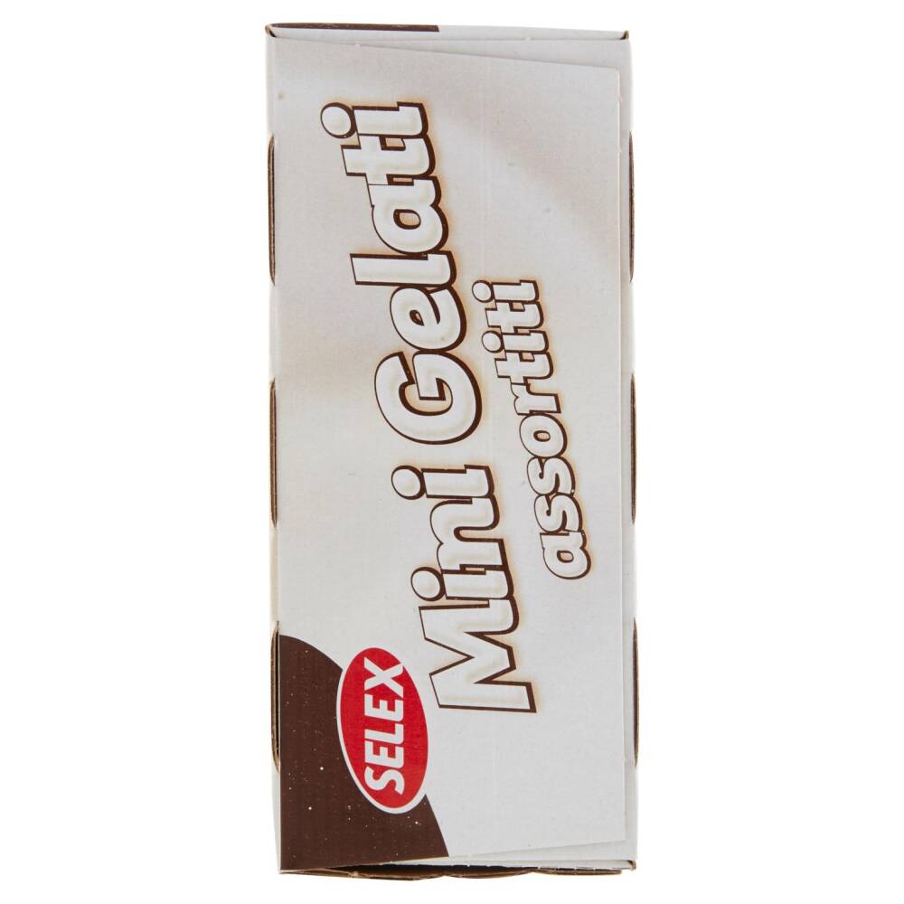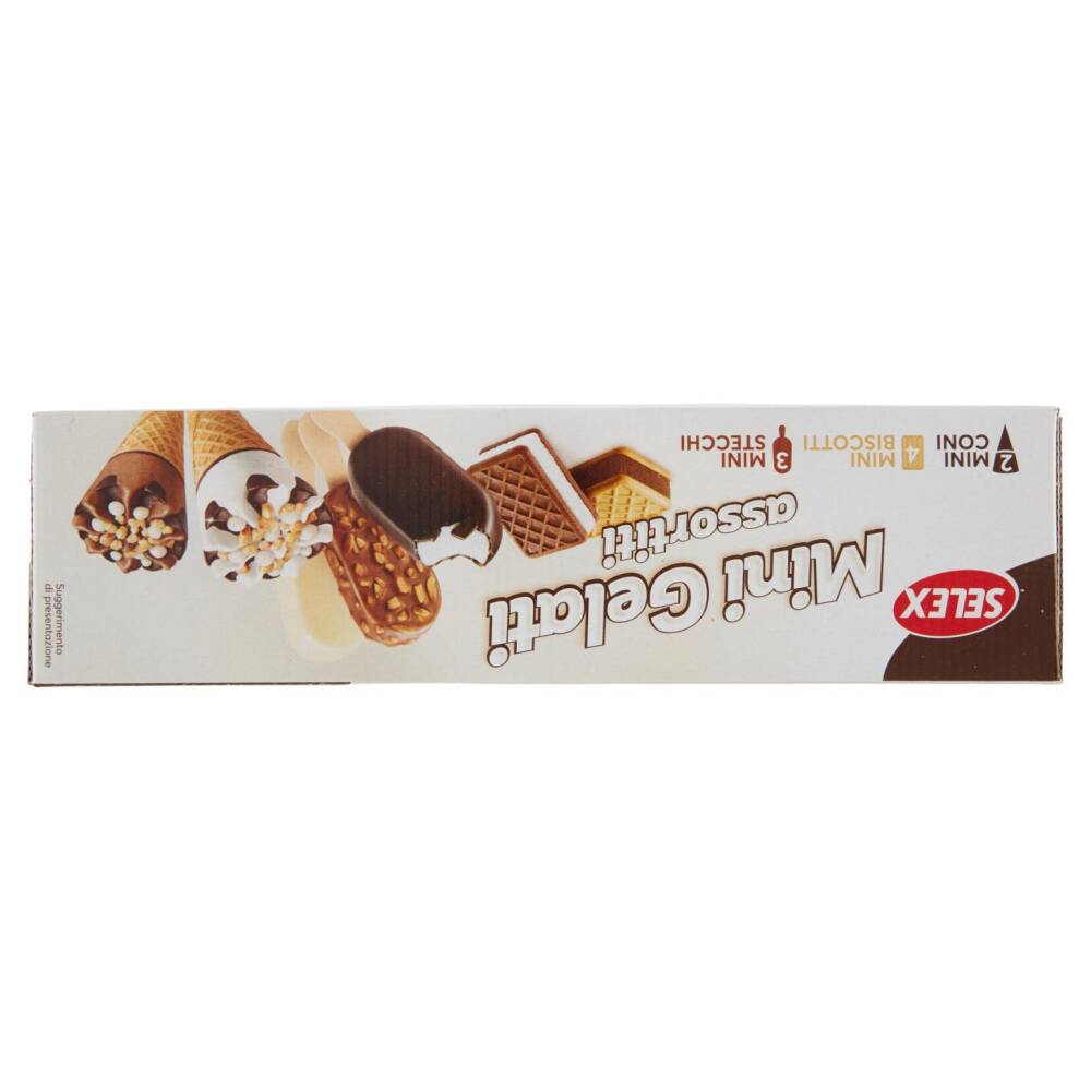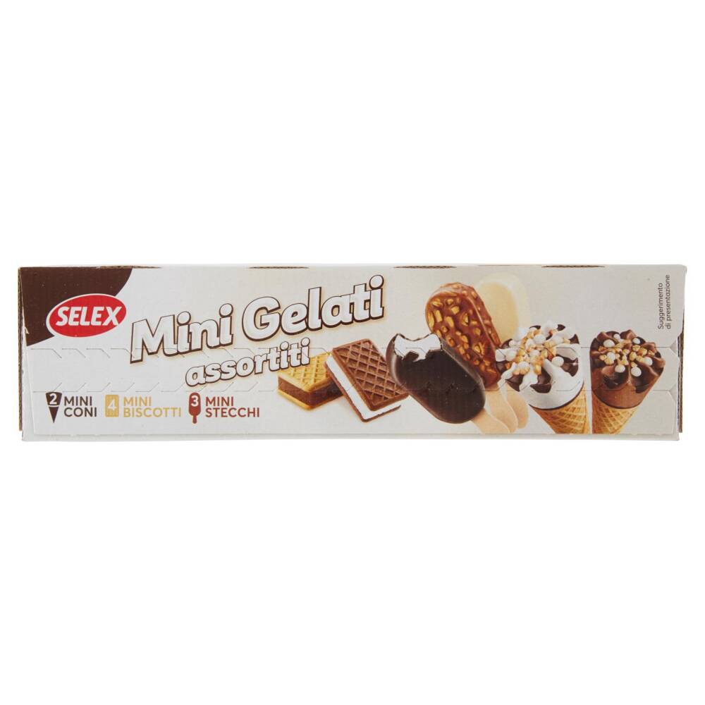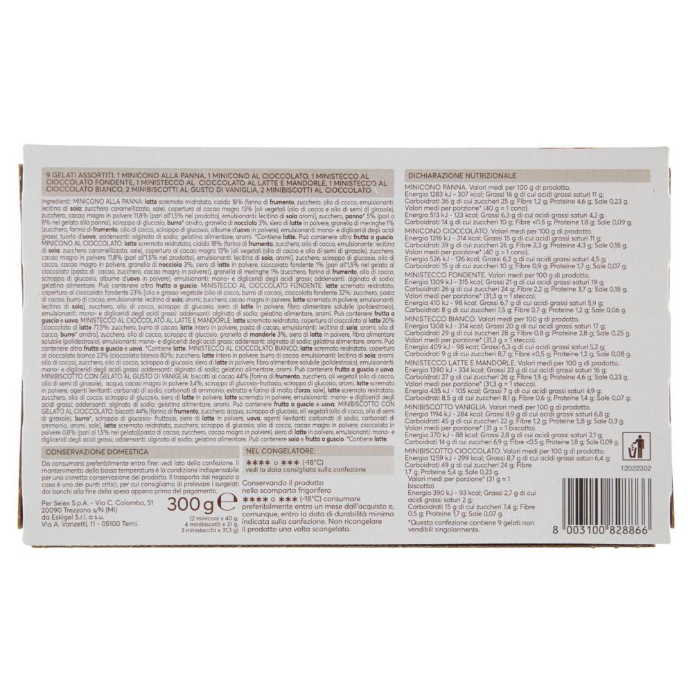 9 Gelati assortiti: 1 minicono alla panna, 1 minicono al cioccolato, 1 ministecco al cioccolato fondente, 1 ministecco al cioccolato al latte e mandorle, 1 ministecco al cioccolato bianco, 2 minibiscotti al gusto di vaniglia, 2 minibiscotti al cioccolato