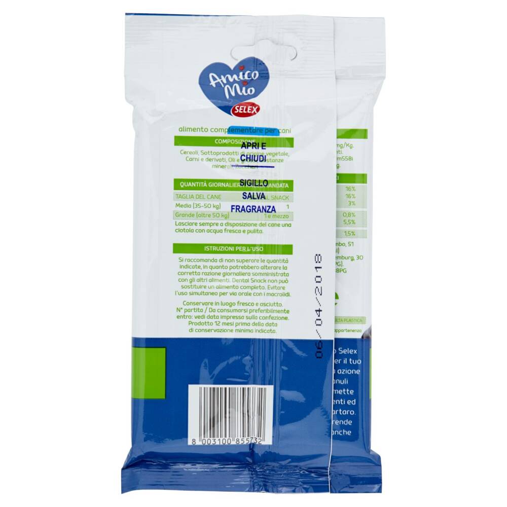 Dental Snack Amico Mio Selex è un beneficio "premio" per il tuo cane. Grazie alla delicata azione abrasiva dei microgranuli di calcio e minerali permette una buona pulizia dei denti ed un minor accumulo di tartaro. La sua consistenza lo rende un giocoso beneficio anche per le gengive.