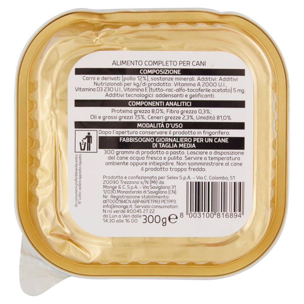 Prodotto e confezionato per Selex S.p.A. Via C. Colombo, 51 20090 Trezzano s/N (MI) da Monge & C. S.p.A. Via Savigliano 31 12030 Monasterolo di Savigliano (CN) Nr. Registrazione stabilimento: αIT000184CN ABP46PETPR3 PETPP3 info@monge.it Servizio consumatori: N.ro verde 80045 27 22 da Lun a Ven dalle 14.30 alle 16.00
