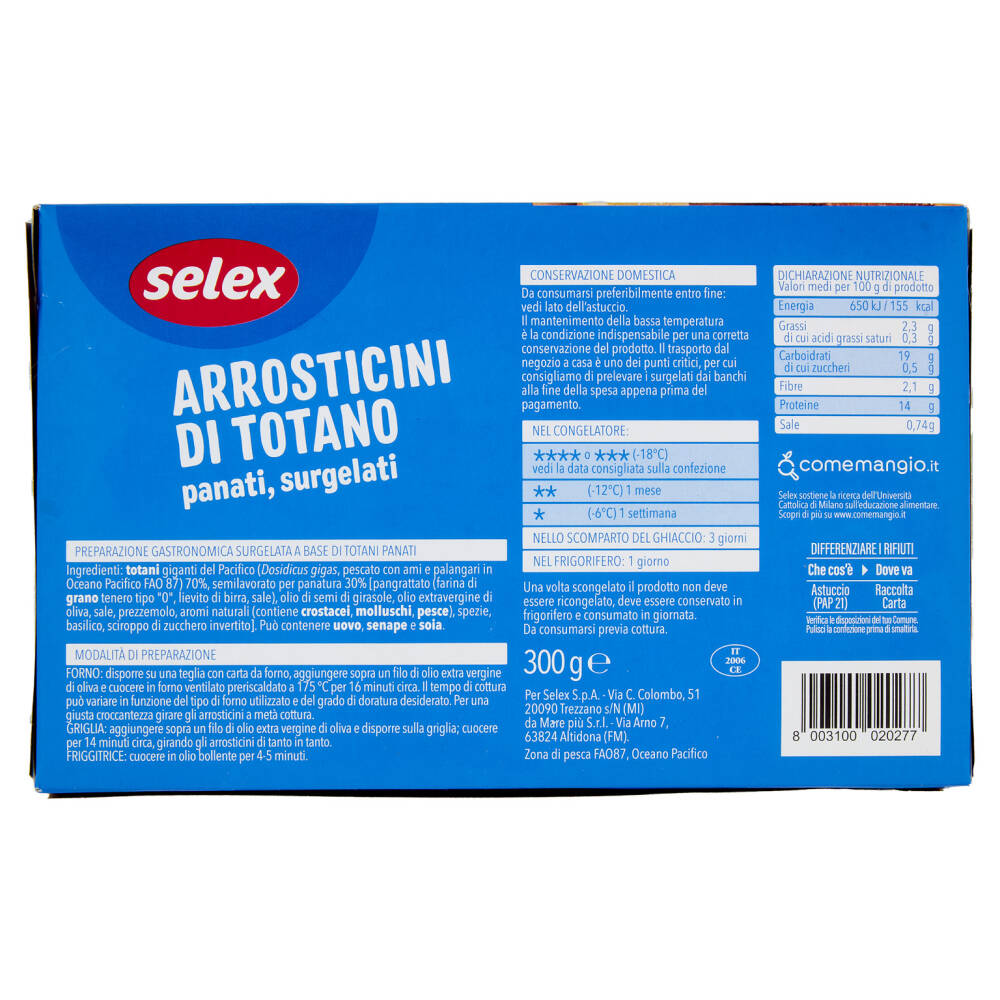 Totani giganti del Pacifico (Dosidicus gigas, pescato con ami e palangari in Oceano Pacifico FAO 87) 70% Semilavorato per panatura 30% [pangrattato (farina di grano tenero tipo "0", lievito di birra, sale), olio di semi di girasole, olio extravergine di oliva, sale, prezzemolo, aromi naturali (contiene crostacei, molluschi, pesce), spezie, basilico, sciroppo di zucchero invertito] Può contenere uovo, senape e soia