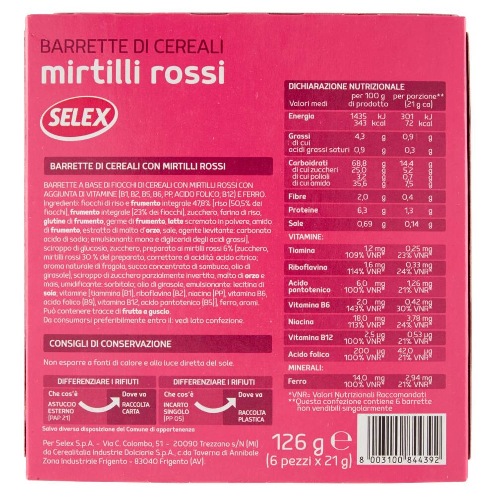 Preparato ai mirtilli rossi 6% (zucchero, mirtilli rossi 30% del preparato, correttore di acidità: acido citrico; aroma naturale di fragola, succo concentrato di sambuco, olio di girasole)