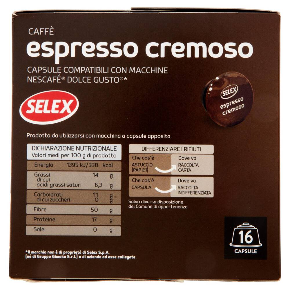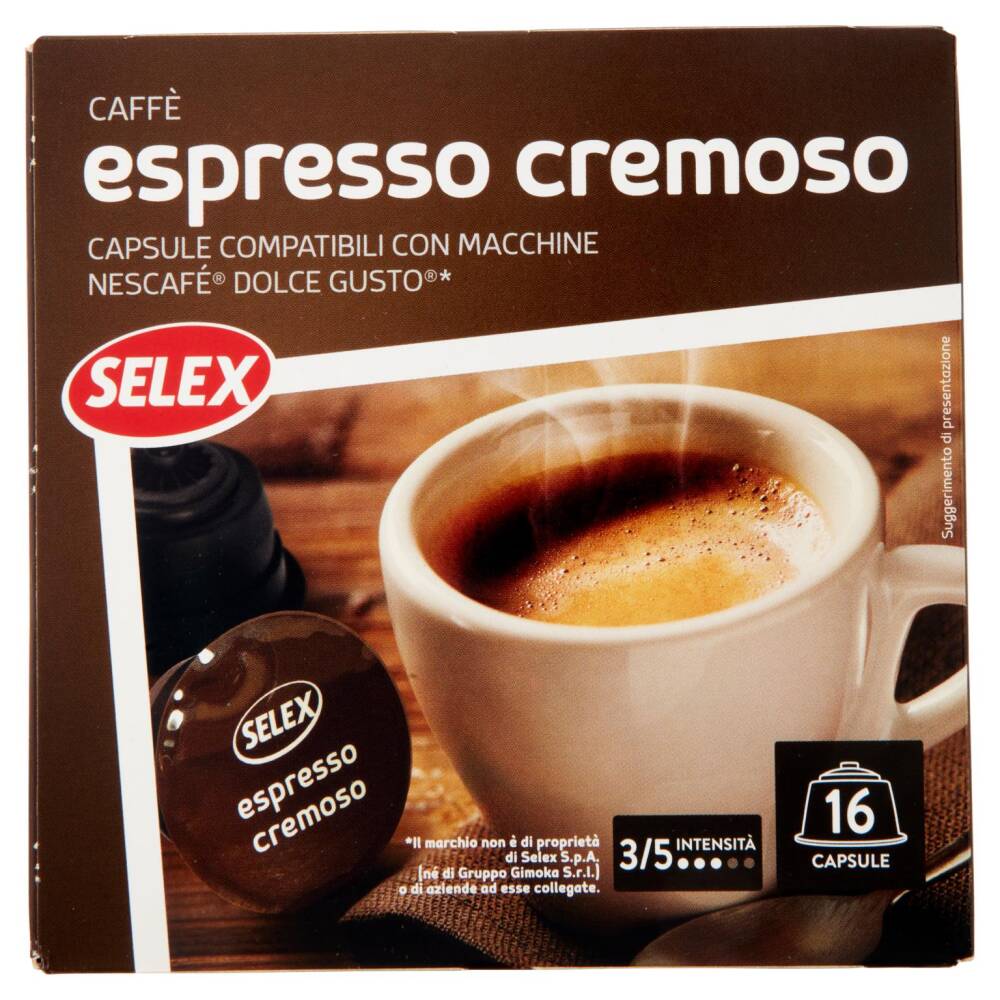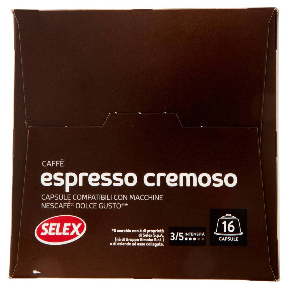Caffè espresso cremoso Capsule compatibili con macchine Nescafé Dolce Gusto* 16 Capsule 3/5 Intensità *Il marchio non è di proprietà di Selex S.p.A. (né di Gruppo Gimoka S.r.l.) o di aziende ad esse collegate
