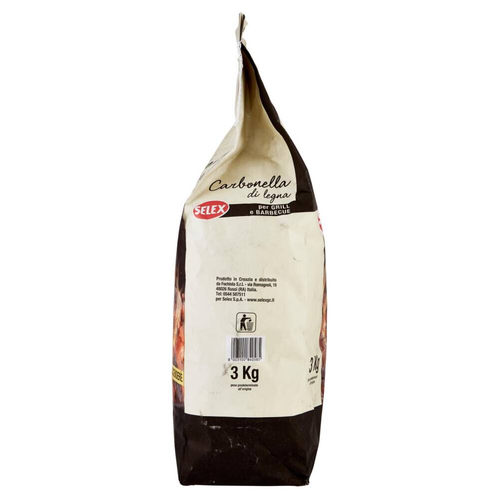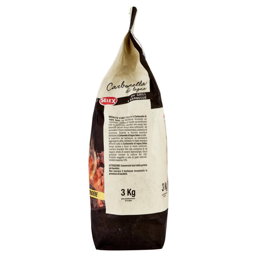 Modalità d'uso: Disporre la Carbonella di legna Selex sul barbecue formando un mucchietto. Irrorare di liquido accendifuoco tutta la carbonella; lasciare che venga ben assorbito (alcuni minuti sono sufficienti) ed accendere il fuoco mantenendosi a distanza di sicurezza. Quando la fiamma svanisce distribuire la Carbonella di legna Selex su tutta la superficie del barbecue: se necessario aggiungerne altra. ventilare in modo energico affinché tutta la Carbonella di legna Selex venga accesa e bruci in modo uniforme. Lasciare bruciare fino alla comparsa di un leggero strato di cenere bianco/grigia. Ora è possibile iniziare la cottura dei cibi. Prodotto soggetto a calo di peso naturale. Umidità massima 10%