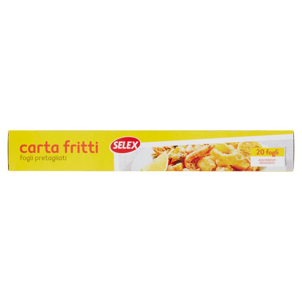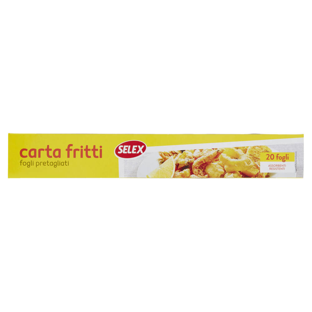 La Carta fritti Selex è realizzata in carta ad elevata assorbenza e consente di trattenere l'unto in eccesso dei cibi fritti, mantenendoli croccanti e saporiti ma con meno grassi. Particolarmente robusta è realizzata in grandi fogli già separati, monostrato e stesi. La Carta fritti Selex può essere utilizzata anche nel forno a microonde per coprire i recipienti (senza che venga a contatto con i cibi) per evitare di sporcare le pareti del forno con schizzi.