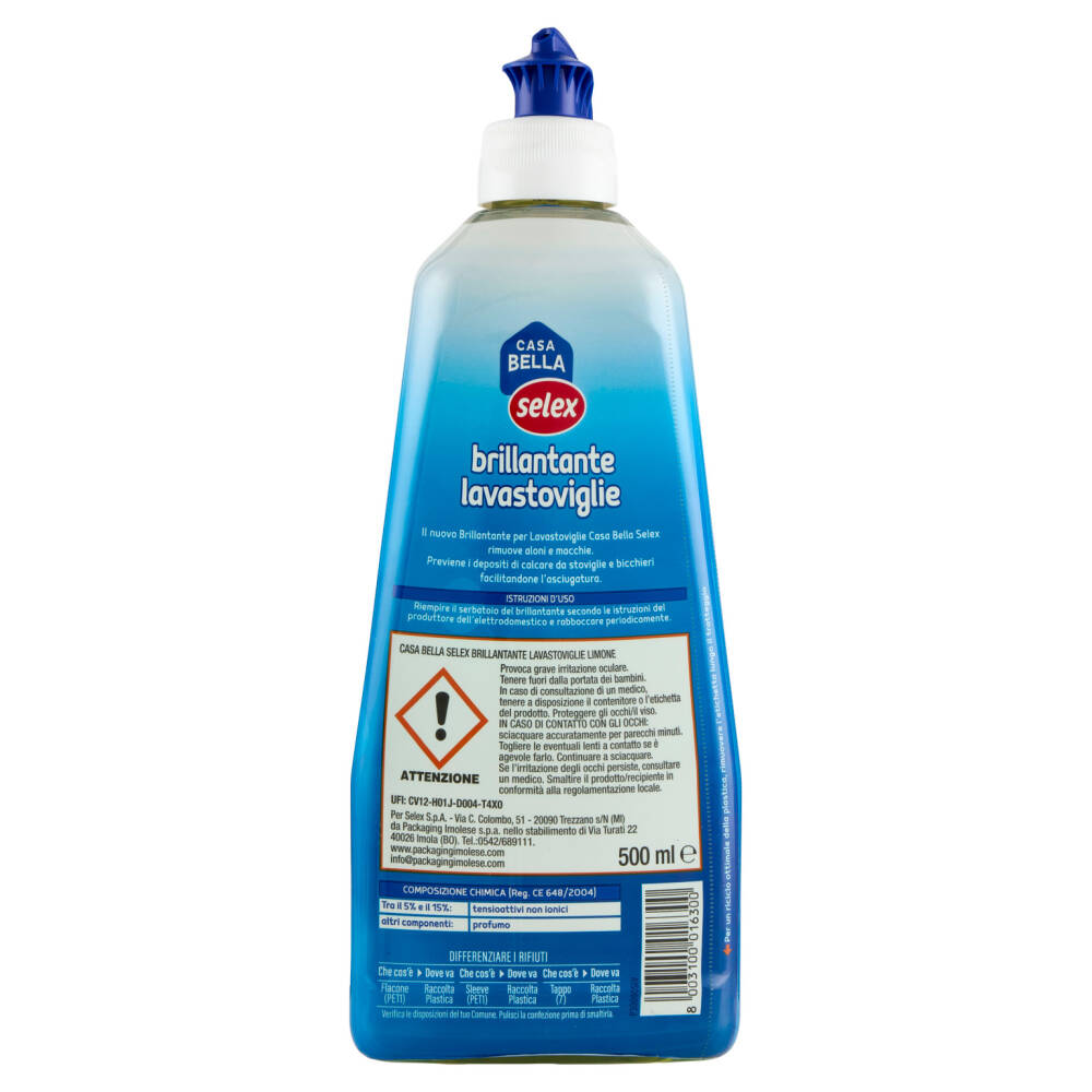 Il nuovo Brillantante per Lavastoviglie Casa Bella Selex rimuove aloni e macchie. Previene i depositi di calcare da stoviglie e bicchieri facilitandone l'asciugatura.
