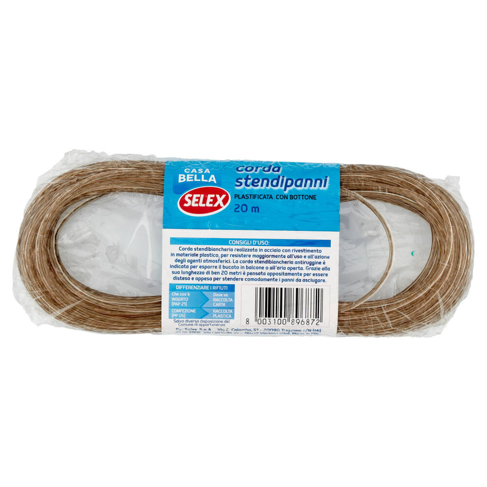 Corda stendibiancheria realizzata in acciaio con rivestimento in materiale plastico, per resistere maggiormente all'uso e all'azione degli agenti atmosferici. La corda stendibiancheria antiruggine è indicata per esporre il bucato in balcone o all'aria aperta. Grazie alla sua lunghezza di ben 20 metri è pensata appositamente per essere distesa e appesa per stendere comodamente i panni da asciugare.